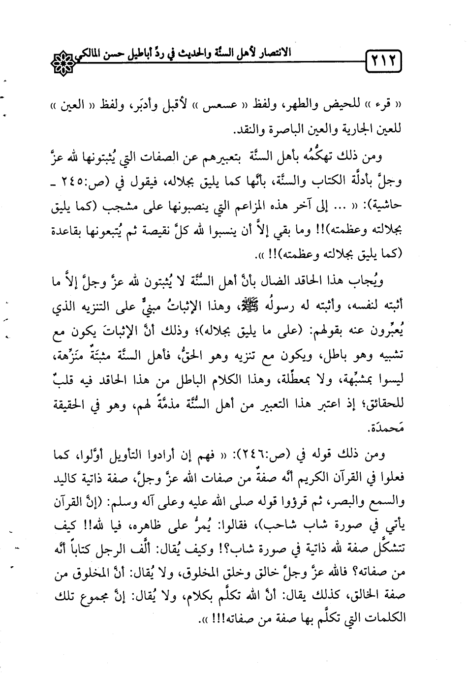 ومن ذلك تهكُّمُه بأهل السنَّة بتعبيرهم عن الصفات التي يُثبتونها لله عزَّ وجلَّ بأدلَّة الكتاب والسنَّة، بأنَّها كما يليق بجلاله، فيقول في (ص: 245 ـ حاشية) : " ... إلى آخر هذه المزاعم التي ينصبونها على مشجب (كما يليق بجلالته وعظمته) !! وما بقي إلاَّ أن ينسبوا لله كلَّ نقيصة ثم يُتبعونها بقاعدة (كما يليق بجلالته وعظمته) !! ".