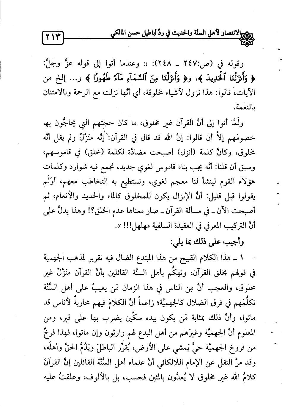 1 ـ هذا الكلام القبيح من هذا المبتدع الضال فيه تقرير لمذهب الجهمية في قولهم بخلق القرآن، وتهكُّم بأهل السنَّة القائلين بأنَّ القرآن منَزَّلٌ غير مخلوق، والعجب أنَّ مِن الناس في هذا الزمان مَن يعيبُ على أهل السُّنَّة تكلُّمَهم في فرق الضلال كالجهميَّة؛ زاعماً أنَّ الكلامَ فيهم محاربةٌ لأناس قد ماتوا، وأنَّ ذلك بمثابة مَن يكون بيده سكِّين يضرب بها على قبر، ومن المعلوم أنَّ الجهميَّة وغيرَهم من أهل البدع لهم وارثون وإن ماتوا، فهذا فرخٌ من فروخ الجهميَّة حيٌّ يَمشي على الأرض، يُقرِّر الباطلَ ويَذُمُّ الحقَّ وأهلَه، وقد مرَّ النقل عن الإمام اللالكائي أنَّ علماء أهل السُّنَّة القائلين إنَّ القرآنَ كلامُ الله غير مخلوق لا يُعدُّون بالمئين فحسب، بل بالألوف، وعلقتُ عليه