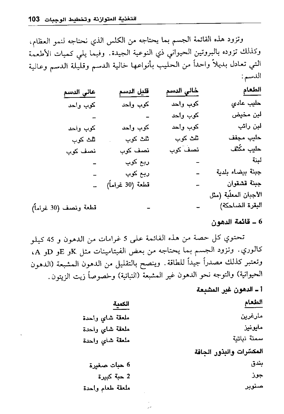 وتزود هذه القائمة الجسم بما يحتاجه من الكلس الذي نحتاجه لنمو العظام، وكذلك تزوده بالبروتين الحيواني ذي النوعية الجيدة. وفيما يلي كميات الأطعمة التي تعادل بديلا واحدا من الحليب بأنواعها خالية الدسم وقليلة الدسم وعالية الدسم:
