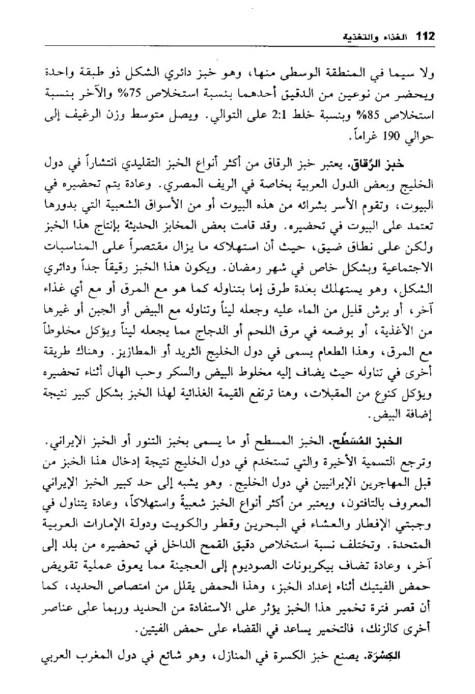 الخبز المسطح. الخبز المسطح أو ما يسمى بخبز التنور أو الخبز الإيراني. وترجع التسمية الأخيرة والتي تستخدم في دول الخليج نتيجة إدخال هذا الخبز من قبل المهاجرين الإيرانيين في دول الخليج. وهو يشبه إلى حد كبير الخبز الإيراني المعروف بالتافتون، ويعتبر من أكثر أنواع الخبز شعبية واستهلاكا، وعادة يتناول في وجبتي الإفطار والعشاء في البحرين وقطر والكويت ودولة الإمارات العربية المتحدة. وتختلف نسبة استخلاص دقيق القمح الداخل في تحضيره من بلد إلى آخر، وعادة تضاف بيكربونات الصوديوم إلى العجينة مما يعوق عملية تقويض حمض الفيتيك أثناء إعداد الخبز، وهذا الحمض يقلل من امتصاص الحديد، كما أن قصر فترة تخمير هذا الخبز يؤثر على الاستفادة من الحديد وربما على عناصر أخرى كالزنك، فالتخمير يساعد في القضاء على حمض الفيتين.