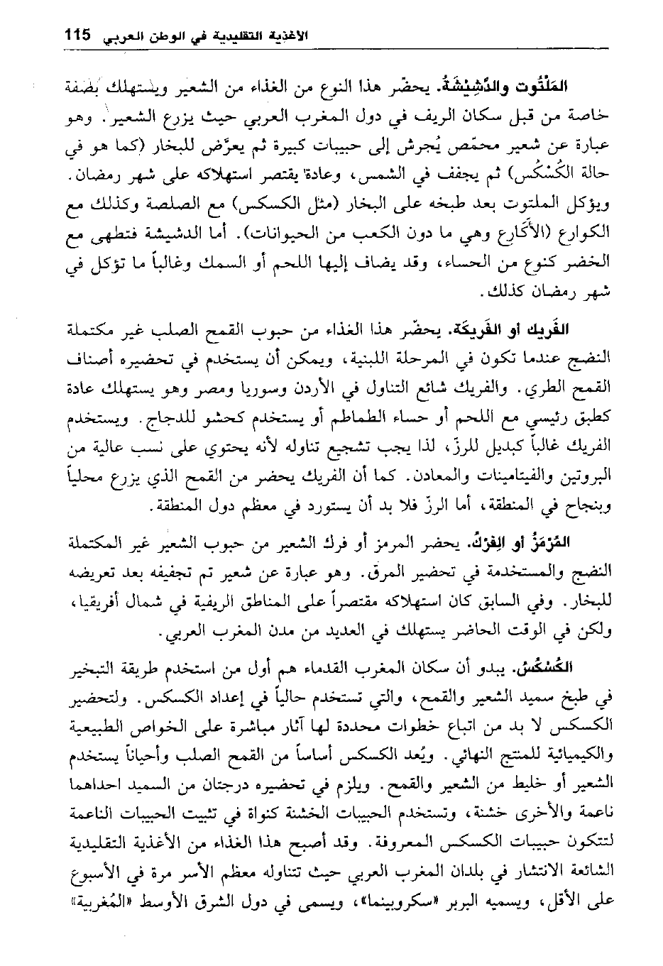 الكسكس. يبدو أن سكان المغرب القدماء هم أول من استخدام طريقة التبخير في طبخ سميد الشعير والقمح، والتي تستخدم حاليا في إعداد الكسكس. ولتحضير الكسكس لا بد من اتباع خطوات محددة لها آثار مباشرة على الخواص الطبيعية والكيميائية للمنتج النهائي. ويعد الكسكس أساسا من القمح الصلب وأحيانا يستخدم الشعير أو خليط من الشعير والقمح. ويلزم في تحضيره درجتان من السميد إحداهما ناعمة والأخرى خشنة، وتستخدم الحبيبات الخشنة كنواة في تثبيت الحبيبات الناعمة لتتكون حبيبات الكسكس المعروفة. وقد أصبح هذا الغذاء من الأغذية التقليدية الشائعة الانتشار في بلدان المغرب العربي حيث تتناوله معظم الأسر مرة في الأسبوع على الأقل، ويسميه البربر "سكر وبينما"، ويسمى في دول الشرق الأوسط "المغربية"