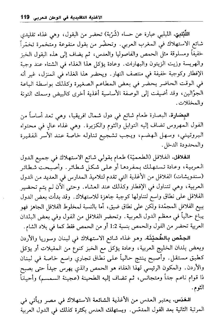 الفلافل. الفلافل "الطعمية" طعام بقولي شائع الاستهلاك في جميع الدول العربية، وعادة تستهلك بمفردها أو على شكل شطائر. وأصبحت شطائر "سندويشات" الفلافل من الأغذية التي تقدم لتلاميذ المدارس في العديد من الدول العربية، وهي تتناول في الإفطار وكذلك عند العشاء. وحتى الآن لم يتم تحضير الفلافل على نطاق واسع لتناولها كوجبة جاهزة للاستهلاك. وقد بدأت بعض الدول ببيع الفلافل المجمدة ولكن على نطاق ضيق، أما بالنسبة لمخلوط الفلافل الجاهز فهو يباع حاليا في معظم الدول العربية. وتحضر الفلافل من الفول وفي بعض البلدان العربية تحضر من الفول والحمص بنسبة 1:2 أو من الحمص فقط كما في بلاد الشام.