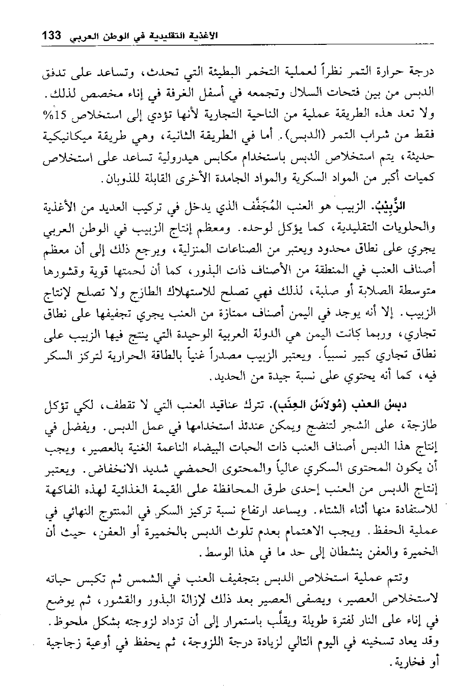 الزبيب: الزبيب هو العنب المجفف الذي يدخل في تركيب العديد من الأغذية والحلويات التقليدية، كما يؤكل لوحده. ومعظم إنتاج الزبيب في الوطن العربي يجري على نطاق محدود ويعتبر من الصناعات المنزلية، ويرجع ذلك إلى أن معظم أصناف العنب في المنطقة من الأصناف ذات البذور، كما أن لحمتها قوية وقشورها متوسطة الصلابة أو صلبة، لذلك فهي تصلح للاستهلاك الطازج ولا تصلح لإنتاج الزبيب. إلا أنه يوجد في اليمن أصناف ممتازة من العنب يجري تجفيفها على نطاق تجاري، وربما كانت اليمن هي الدولة العربية الوحيدة التي ينتج فيها الزبيب على نطاق تجاري كبير نسبيا. ويعتبر الزبيب مصدرا غنيا بالطاقة الحرارية لتركز السكر فيه، كما أنه يحتوي على نسبة جيدة من الحديد.