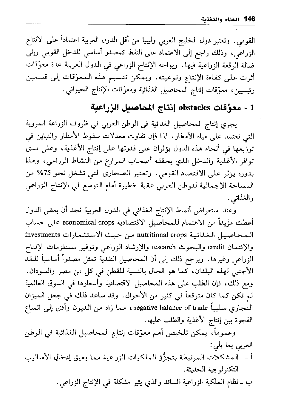 وعند استعراض أنماط الإنتاج الغذائي في الدول العربية نجد أن بعض الدول أعطت مزيدا من الاهتمام للمحاصيل الاقتصادية ESONOMICA; CROPS على حساب المحاصيل الغذائية NUTRITIONAL SROPS من حيث الاستثمارات INVESTMENTS والإئتمان CREDIT والبحوث RESEARCH والإرشاد الزراعي وتوفير مستلزمات الإنتاج الزراعي وغيرها. ويرجع ذلك إلى أن المحاصيل النقدية تمثل مصدرا أساسيا للنقد الأجنبي لهذه البلدان، كما هو الحال بالنسبة للقطن في كل من مصر والسودان. ومع ذلك، فإن الطلب على هذه المحاصيل الاقتصادية وأسعارها في السوق العالمية لم تكن كما كان متوقعا في كثير من الأحوال. وقد ساعد ذلك في جعل الميزان التجاري سلبيا NEGATIVE BALANCE OF TRADE، مما زاد من الديون وأدى إلى اتساع الفجوة بين إنتاج الأغذية والطلب عليها.