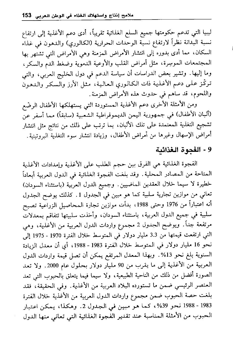 الفجوة الغذائية هي الفرق بين حجم الطلب على الأغذية وإمدادات الأغذية المتاحة من المصادر المحلية. وقد بلغت الفجوة الغذائية في الدول العربية أبعادا خطيرة لا سيما خلال العقدين الماضيين. وجمع الدول العربية "باستثناء السودان" تعاني من موازين تجارية سلبية كما هو مبين في الجدول1. كذلك يوضح الجدول أنه اعتبارا من 1976 وحتى 1988، بدأت موازين تجارة المحاصيل الزراعية تصبح سلبية في جميع الدول العربية، باستثناء السودان، وأخذت سلبيتها تتفاقم بمعدلات مرتفعة جدا. ويوضح الجدول 2 مجموع واردات الدول العربية من الأغذية، وهي التي ارتفعت قيمتها من 3.3 مليار دولار في المتوسط خلال الفترة 1975-1970 إلى نحو16 مليار دولار في المتوسط خلال الفترة 1988/1983، أي أن معدل الزيادة السنوية بلغ نحو 13 %. وبهذا المعدل المرتفع يمكن أن تصل قيمة واردات الدول العربية من الأغذية إلى ما يقرب من 90 مليار دولار بحلول عام 2000. ولا تعد الصورة أفضل من ذلك من الناحية الطبيعية، ولا سيما فيما يتعلق بالحبوب التي تعد العنصر الرئيسي ضمن ما تستورده البلاد العربية من الأغذية. وفي الحقيقة، فقد بلغت حصة الحبوب ضمن مجموع واردات الدول العربية من الأغذية خلال الفترة 1988-1983 نحو 39 %، كما هو مبين في الجدول 2. وهكذا، يمكن اعتبار الحبوب من الأمثلة المناسبة عند تقدير الفجوة الغذائية التي تعاني منها الدول