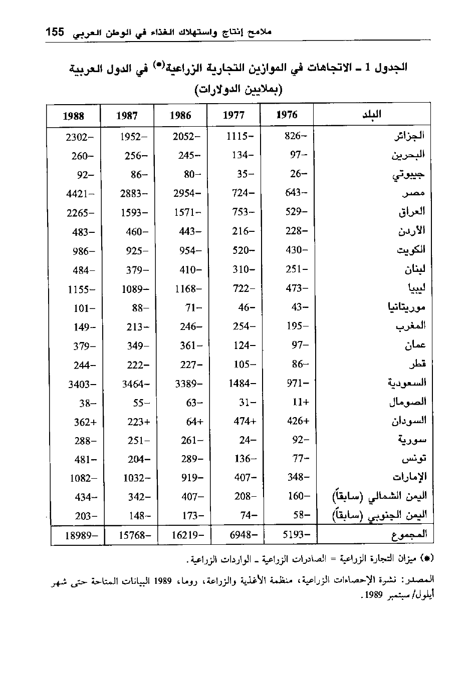 المصدر: نشرة الإحصاءات الزراعية، منظمة الأغذية والزراعة، روما، 1989البيانات المتاحة حتى شهر أيلول/ سبتمبر 1989.