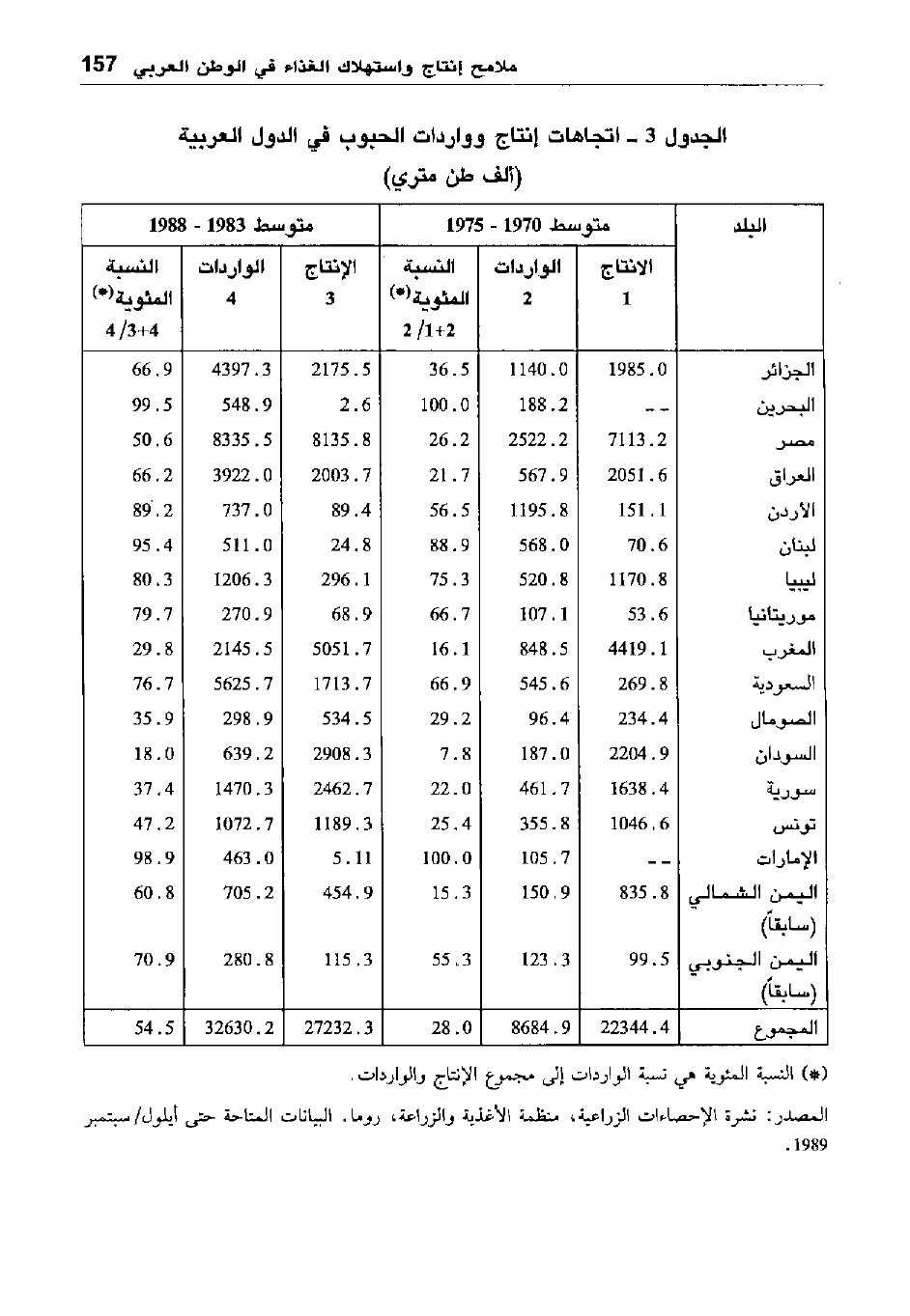المصدر: نشرة الإحصاءات الزراعية، منظمة الأغذية والزراعة، روما. البيانات المتاحة حتى أيلول/ سبتمبر 1989.