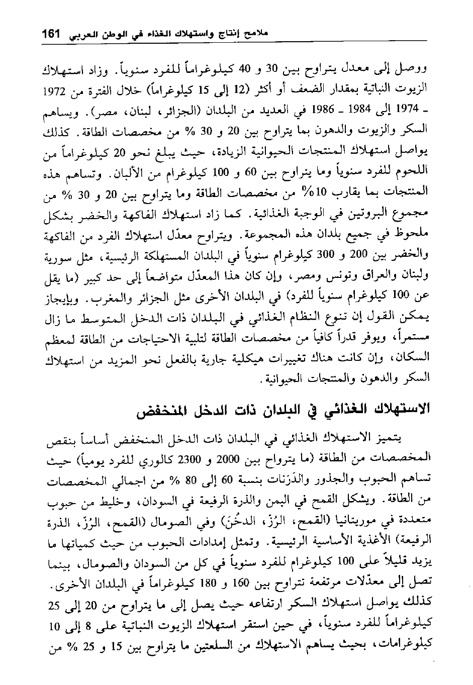 ووصل إلى معدل يتراوح بين 30 و 40 كيلو غرام للفرد سنويا. وزاد استهلاك الزيوت النباتية بمقدار الضعف أو أكثر "12 إلى 15 كيلو غرام" خلال الفترة من 1974-1972 إلى 1986-1984 في العديد من البلدان "الجزائر، لبنان، مصر". ويساهم السكر والزيوت والدهون بما يتراوح بين 20 و 30 % من مخصصات الطاقة. كذلك يواصل استهلاك المنتجات الحيوانية الزيادة، حيث يبلغ نحو 20 كيلو غرام من اللحوم للفرد سنويا وما يتراوح بين 60 و 100 كيلو غرام من الألبان. وتساهم هذه المنتجات بما يقارب 10 % من مخصصات الطاقة وما يتراوح بين 20 و 30 % من مجموع البروتين في الوجبة الغذائية. كما زاد استهلاك الفاطهة والخضر بشكل ملحوظ في جميع بلدان هذه المجموعة. ويتراوح معدل استهلاك الفرد من الفاكهة والخضر بين 2000 و 3000 كيلو غرام سنويا في البلدان المستهلكة الرئيسية، مثل سورية ولبنان والعراق وتونس ومصر، وإن كان هذا المعدل متواضعا إلى حد كبير "ما يقل عن 100 كيلو غرام سنويا للفرد" في البلدان الأخرى مثل الجزائر والمغرب. وبإيجاز يمكن القول إن تنوع النظام الغذائي في البلدان ذات الدخل المتوسط ما زال مستمرا، ويوفر قدرا كافيا من مخصصات الطاقة لتلبية الاحتياجات من الطاقة لمعظم السكان، وإن كانت هناك تغييرات هيكيلية جارية بالفعل نحو المزيد من استهلاك السكر والدهون والمنتجات الحيوانية.