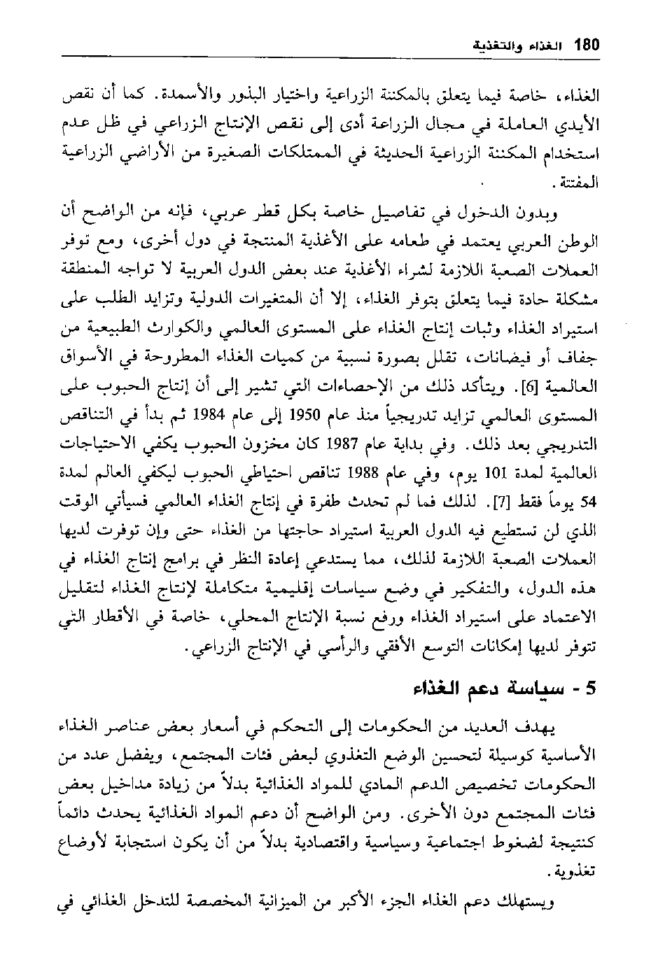 وبدون الدخول في تفاصيل خاصة بكل قطر عربي، فإنه من الواضح أن الوطن العربي يعتمد على الأغذية المنتجة في دول أخرى، ومع توفر العملات الصعبة اللازمة لشراء الأغذية عند بعض الدول العربية لا تواجه المنطقة مشكلة حادة فيما يتعلق بتوفر الغذاء، إلا أن المتغيرات الدولية وتزايد الطلب على استيراد الغذاء وثبات إنتاج الغذاء على المستوى العالمي والكوارث الطبيعية من جفاف أو فيضانات، تقلل بصورة نسبية من كميات الغذاء المطروحة في الأسواق العالمية [6] ويتأكد ذلك من الإحصاءات التي تشير إلى أن إنتاج الحبوب على المستوى العالمي تزايد تدريجيا منذ عام 1950 إلى عام 1984 ثم بدأ في التناقص التدريجي بعد ذلك. وفي بداية عام 1987 كان مخزون الحبوب لا يكفي الاحتياجات العالمية لمدة 101 يوم، وفي عام 1988 تناقص احتياطي الحبوب ليكفي العالم لمدة 54 يوما فقط [7] لذلك فما لم تحدث طفرة في إنتاج الغذاء العالمي فسيأتي الوقت الذي لن تستطيع فيه الدول العربية استيراد حاجتها من الغذاء حتى وإن توفرت لديها العملات الصعبة اللازمة لذلك، مما يستدعي إعادة النظر في برامج إنتاج الغذاء في هذه الدول، والتفكير في وضع سياسيات إقليمية متكاملة لإنتاج الغذاء لتقليل الاعتماد على استيراد الغذاء ورفع نسبة الإنتاج المحلي، خاصة في الأقطار التي تتوفر لديها إمكانات التوسع الأفقي والرأسي في الإنتاج الزراعي.