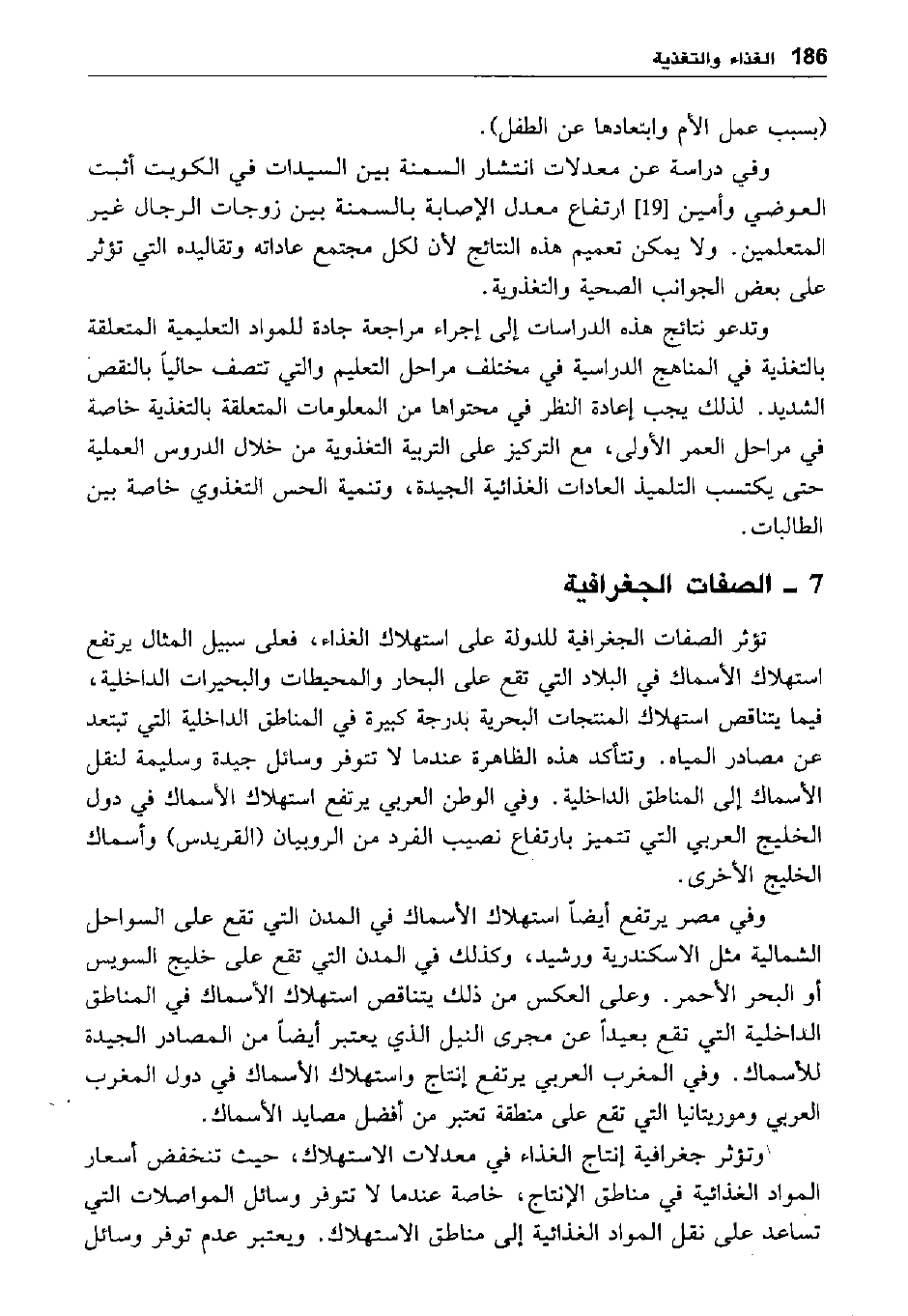 تؤثر الصفات الجغرافية للدولة على استهلاك الغذاء، فعلى سبيل المثال يرتفع استهلاك الأسماك في البلاد التي تقع على البحار والمحيطات والبحيرات الداخلية، فيما يتناقص استهلاك المنتجات البحرية بدرجة كبيرة في المناطق الداخلية التي تبتعد عن مصادر المياه. وتتأكد هذه الظاهرة عندما لا تتوفر وسائل جيدة وسليمة لنقل الأسماك إلى المناطق الداخلية. وفي الوطن العربي يرتفع استهلاك الأسماك في دول الخليج العربي التي تتميز بارتفاع نصيب الفرد من الروبيان "القريدس" وأسماك الخليج الأخرى.