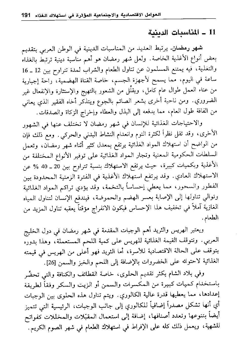 شهر رمضان: يرتبط العديد من المناسبات الدينية في الوطن العربي يتقديم بعض أنواع الأغذية الخاصة. ولعل شهر رمضان هو أهم مناسبة دينية ترتبط بالغذاء والتغذية، فيه يمتنع المسلمون عن تناول الطعام والشراب لمدة تتراوح بين 12-16 ساعة في اليوم، مما يسمح لأجهزة الجسم، خاصة القناة الهضمية، براحة إجبارية من عناء العمل طوال عام كامل، ويقلل من الشعور بالتهيج والاستثارة والانفعال غير الضروري. ومن ناحية أخرى يشعر الصائم بالجوع ويتذكر أخاه الفقير الذي يعاني من الفاقة طول العام، مما يدفعه إلى البذل والعطاء وإخراج الزكاة والصدقات.