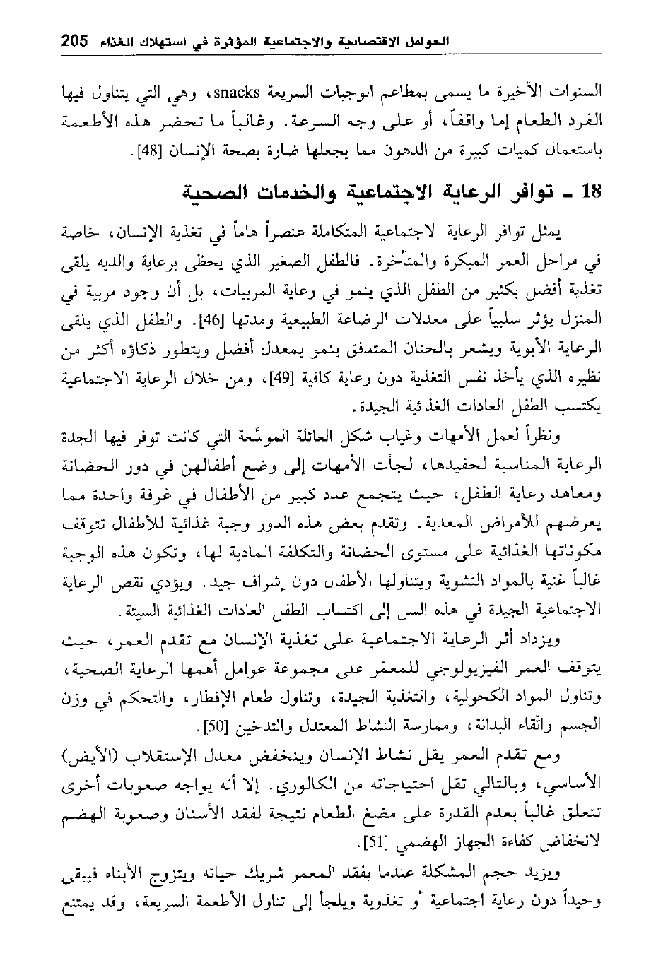 ويزداد أثر الرعاية الاجتماعية على تغذية الإنسان مع تقدم العمر، حيث يتوقف العمر الفيزيولوجي للمعمر على مجموعة عوامل أهمها الرعاية الصحية، وتناول المواد الكحولية، والتغذية الجيدة، وتناول طعام الإفطار، والتحكم في وزن الجسم واتقاء البدانة، وممارسة النشاط المعتدل والتدخين [50] .