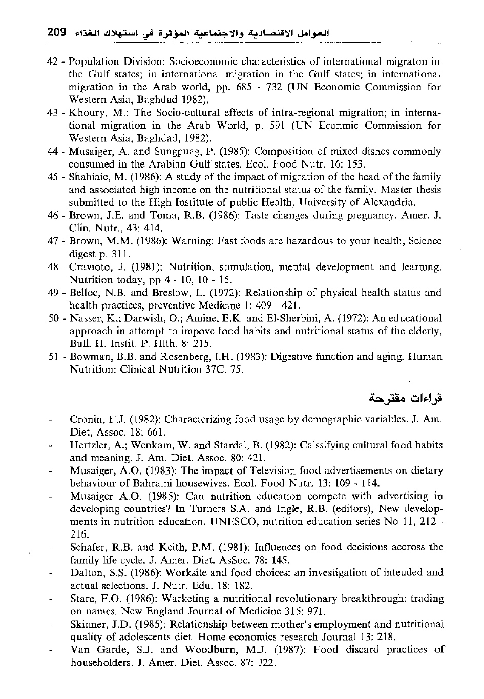 * Musaiger, A.O. (1983) : The impact of Television food advertisements on dietary behaviour of Bahraini housewives. Ecol. Food Nutr. 13: 109 - 114. Musaiger A.O. (1985) ; Can nutrition education compete with advertising in developing countries? In Turners S.A. and Ingle, R.B. (editors) , New developments in nutrition education. UNESCO, nutrition education series No II, 212 -216.