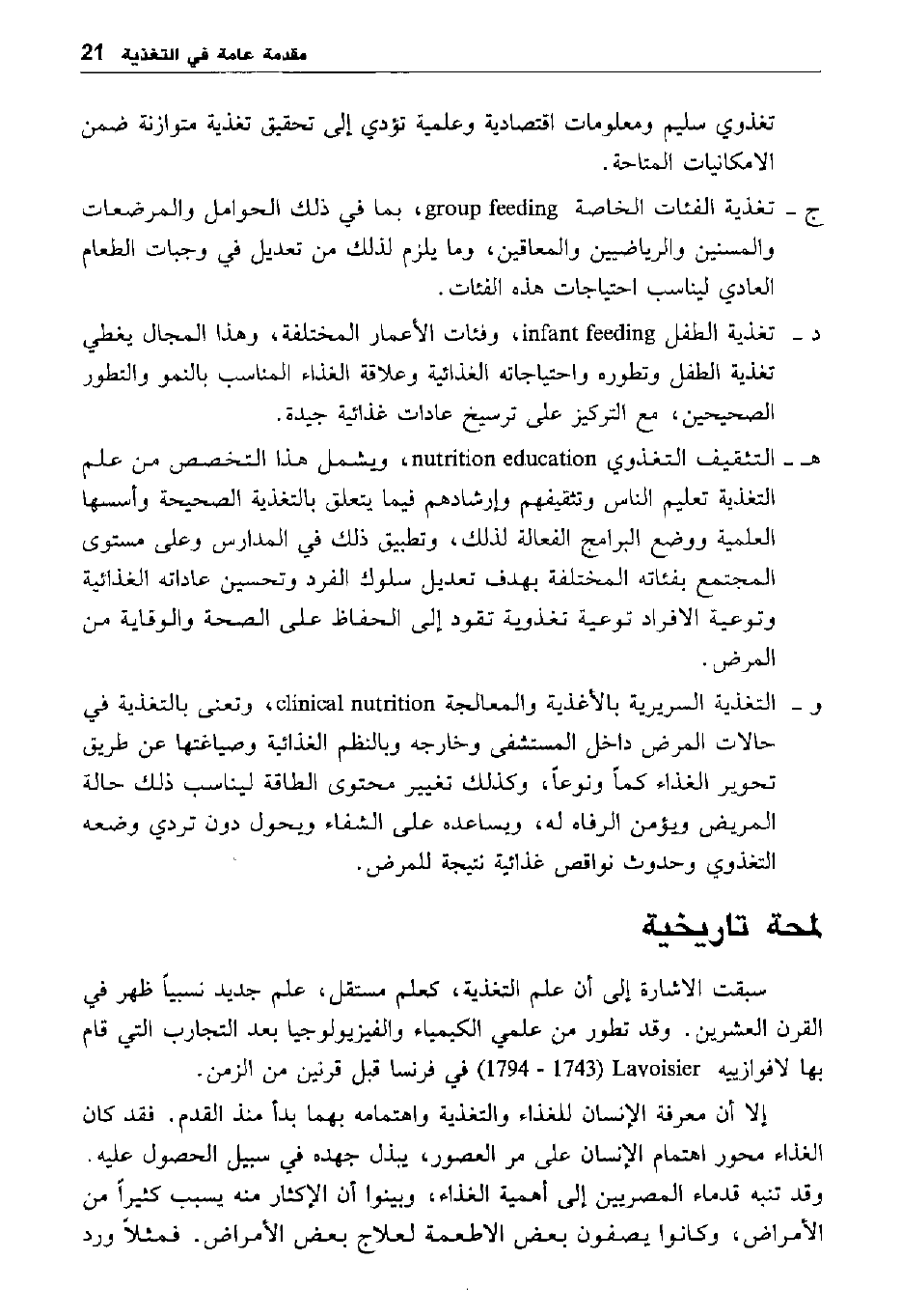 سبقت الإشارة إلى أن علم التغذية، كعلم مستقل، علم جديد نسبيًّا ظهر في القرن العشرين. وقد تطور من علمي الكيمياء والفيزيولوجيا بعد التجارب التي قام بها لافوازييه Lavoisier 1743-1794 في فرنسا قبل قرنين من الزمن.