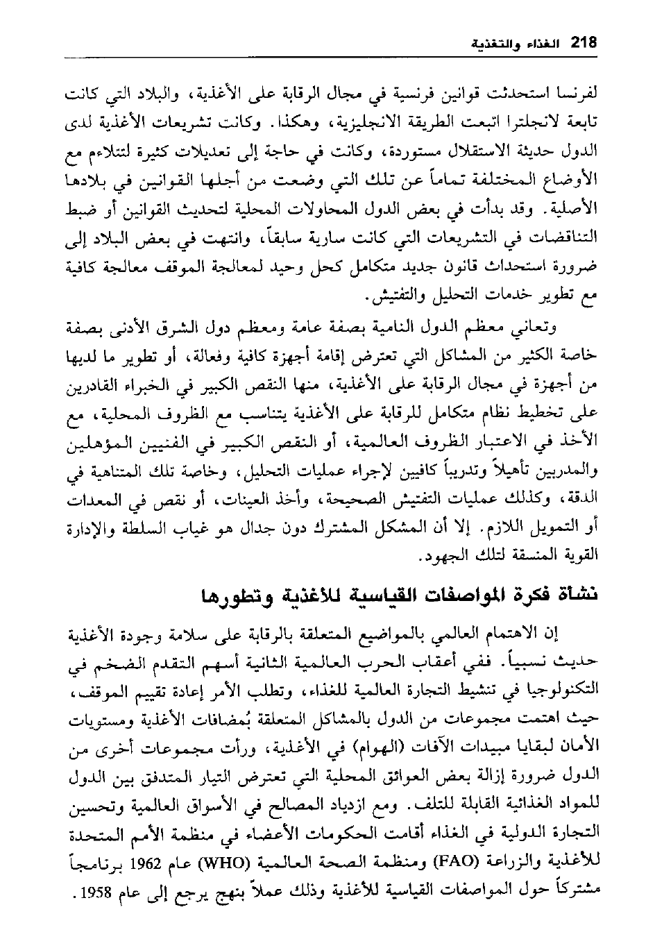 لفرنسا استحدثت قوانين فرنسية في مجال الرقابة على الأغذية، والبلاد التي كانت تابعة لإنجلترا اتبعت الطريقة الإنجليزية، وهكذا. وكانت تشريعات الأغذية لدى الدول حديثة الاستقلال مستوردة، وكانت في حاجة إلى تعديلات كثيرة لتتلاءم مع الأوضاع المختلفة تماما عن تلك التي وضعت من أجلها القوانين في بلادها الأصلية وقد بدأت في بعض الدول المحاولات المحلية لتحديث القوانين أو ضبط التناقضات في التشريعات التي كانت سارية سابقا، وانتهت في بعض البلاد إلى ضرورة استحداث قانون جديد متكامل كحل وحيد لمعالجة الموقف معالجة كافية مع تطوير خدمات التحليل والتفتيش.