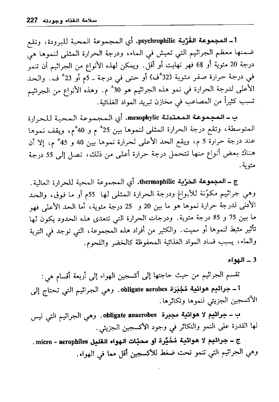 أ- المجموعة القرية psychrophilic: أي المجموعة المحبة للبرودة، وتقع ضمنها معظم الجراثيم التي تعيش في الماء، ودرجة الحراة المثلى لنموها هي درجة 20 مئوية أو 68 فهر نهايت أو أقل: ويمكن لهذه الأنواع من الجراثيم أن تنموو في درجة حرارة صفر مئوية "32ف" أو حتى في درجة -5م أو 23ف. والحد الأعلى لدرجة الحرارة في نمو هذه الجراثيم هو 30م. وهذه الأنواع من الجراثيم تسبب كثيرا من المصاعب في مخازن تبريد المواد الغذائية.