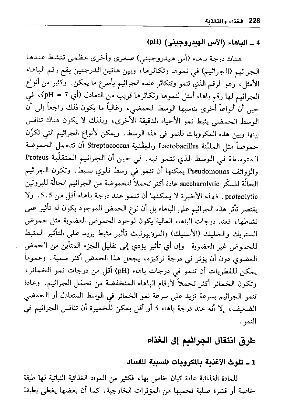 هناك درجة باهاء "أس هيدروجيني" صغرى وأخرى عظمى تنشط عندها الجراثيم "الجراثيم" في نموها وتكاثرها، وبين هاتين الدرجتين يقع رقم الباهاء الأمثل، وهو الرقم الذي تنمو وتتكاثر عنده الجراثيم بأسرع ما يمكن. وكثير من أنواع الجراثيم لها رقم باهاء أمثل لنموها وتكاثرها قريب من التعادل "أي 7= pH في حين أن أنواعا أخرى يناسبها الوسط الحمضي، وغالبا ما يكون ذلك راجعا إلى أن الوسط الحمضي يثبط نمو الأحياء الدقيقة الأخرى، وبذلك لا يكون هناك تنافس بينها وبين هذه المكروبات للنمو في هذا الوسط. ويمكن لأنواع الجراثيم التي تكون حموضا مثل الملبنة lactobacillusوالعقدية streptococcus أن تتحمل الحموضة المتوسطة في الوسط الذي تنمو فيه في حين أن الجراثيم المتقلبة proteus والزوائف Pseudomonas يمكنها أن تنمو في وسط قلوي بسيط. وتكون الجراثيم الحالة للسكر saccharolytic عادة أكثر تحملا للحموضة من الجراثيم الحالة للبروتين proteolytic فهذه الأخيرة لا يمكنها أن تنمو عند درجة باهاء أقل من 505. ولا يقتصر تأثر هذه الجراثيم على الباهاء بل أن نوع الحمض الموجود يكون له تأثير على نشاطهان فعند درجات الباهاء العالية يكون لوجود الحموض العضوية مثل حموض الستريك والخليك "الأستيك" والبروبيونيك" تأثير مثبط يزيد على التأثير المثبط للحموض غير العضوية. وإن أي تأثير يؤدي إلى تقليل الجزء المتأين من الحمض العضوي دون أن يؤثر في درجة تركيزه، يجعل هذا الحمض أكثر سمية. وعموما يمكن للفطريات أن تنمو في درجات باهاء ph أقل من درجات نمو الخمائر، وتكون الخمائر أكثر تحملا لأرقام الباهاء المنخفضة من تحمل الجراثيم. وعادة تنمو الجراثيم بسرعة تزيد على سرعة نمو الخمائر في الوسط المتعادل أو الحمضي الضعيف، إلا أنه عند درجة باهاء 5 أو أقل يمكن للخميرة أن تنافس الجراثيم في النمو.