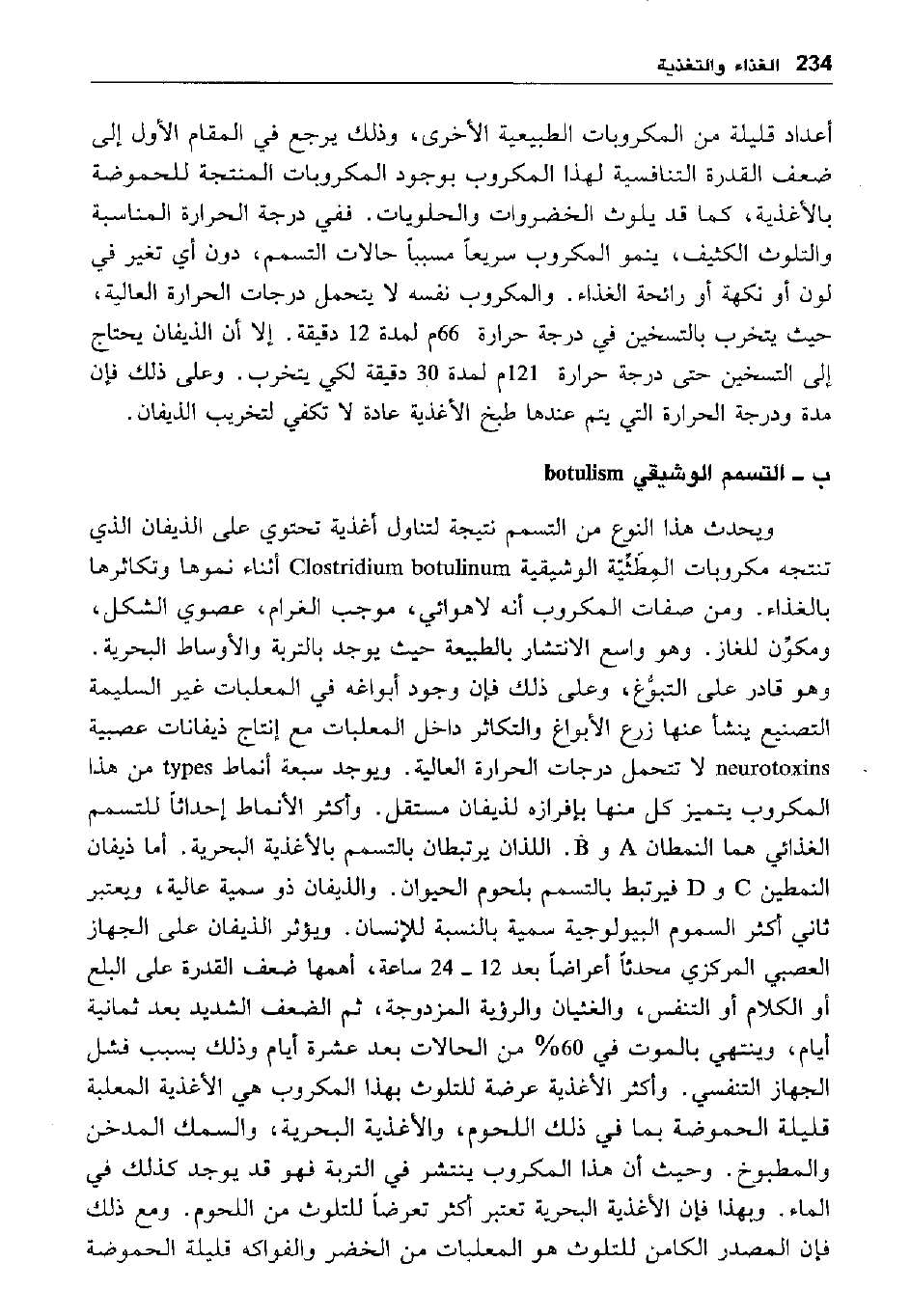 ويحدث هذا النوع من التسمم نتيجة لتناول أغذية تحتوي على الذيفان الذي تنتجه مكروبات المطثية الوشيقية clostridium botulinum أثناء نموها وتكاثرها بالغذاء. ومن صفات المكروب أنه لا هوائي موجب الغرام، عصوي الشكل، ومكون للغاز. وهو واسع الانتشار بالطبيعة حيث يوجد بالتربة والأوساط البحرية وهو قادر على التبوغ، وعلى ذلك فإن وجود أبواغه في المعلبات غير السليمة التصنيع ينشأ عنها زرع الأبواغ والتكاثر داخل المعلبات مع إنتاج ذيفانات عصبية neurotoxins لا تتحمل درجات الحرارة والتكاثر داخل المعلبات مع إنتاج ذيفانات عصبية neurotoxins لا تتحمل درجات الحرارة العالية. ويوجد سبعة أنماط types من هذا المكروب يتميز كل منها بإفرازه لذيفان مستقل. وأكثر الأنماط إحداثا للتسمم الغذائي هما النمطان B, A اللذان يرتبطان بالتسمم بالأغذية البحرية. أما ذيفان النمطين D, C فيرتبط بالتسمم بلحوم الحيوان. والذيفان ذو سمية عالية، ويعتبر ثاني أكثر السموم البيولوجية سمية بالنسبة للإنسان ويؤثر الذيفان على الجهاز العصبي المركزي محدثا أعراضا بعد 12 – 24 ساعة، أهمها ضعف القدرة على البلع أو الكلام أو التنفس، والغثيان والرؤية المزدوجة، ثم الضعف الشديد بعد ثمانية أيام، وينتهي بالموت في 60% من الحالات بعد عشرة أيام وذلك بسبب فشل الجهاز التنفسي. وأكثر الأغذية عرضة للتلوث بهذا المكروب هي الأغذية المعلبة قليلة الحموضة بما في ذلك اللحوم، والأغذية البحرية، والسمك المدخن والمطبوخ. وحيث أن هذا المكروب ينتشر في التربة فهو قد يوجد كذلك في الماء. وبهذا فإن الأغذية البحرية تعتبر أكثر تعرضا للتلوث من اللحوم. ومع ذلك فإن المصدر الكامن للتلوث هو المعلبات من الخضر والفواكه قليلة الحموضة.