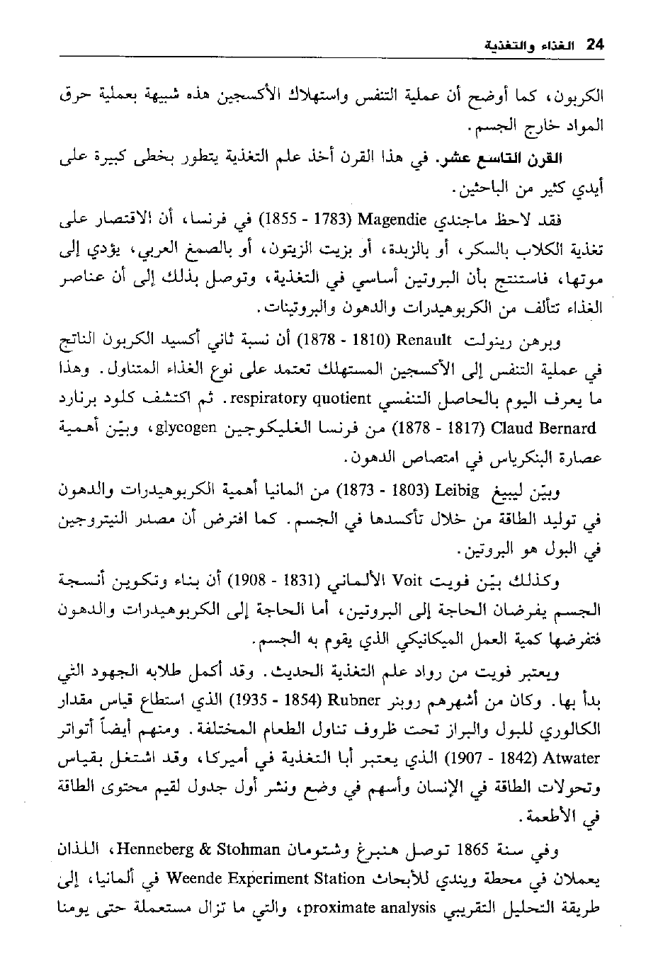 وبرهن رينولت Renault 1810-1878 أن نسبة ثاني أكسيد الكربون الناتج في عملية التنفس إلى الأكسجين المستهلك تعتمد على نوع الغذاء المتناول. وهذا ما يعرف اليوم بالحاصل التنفسي respiratory quotient. ثم اكتشف كلود برنارد claud Bernard 1817-1878 من فرنسا الغليكوجين glycogen وبين أهمية عصارة البنكرياس في امتصاص الدهون.