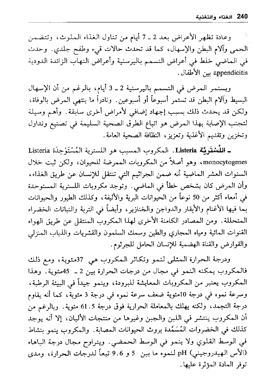 - اللسترية Listeria: المكروب المسبب هو اللسترية المستوحدة Listeria monocytogenes، وهو أصلا من المكروبات الممرضة للحيوان، ولكن ثبت خلال السنوات العشر الماضية أنه ضمن الجراثيم التي تنتقل للإنسان عن طريق الغذاء، وأن المرض كان يشخص خطأ في الماضي. وتوجد مكروبات اللسترية المستوحدة في أمعاء أكثر من 50 نوعا من الحيوانات البرية والأليفة، وكذلك الطيور والحيوانات بما فيها الأغنام والأبقار والدواجن والخنازير، وأيضا في التربة والنباتات الخضراء المتحللة. ومن المصادر الكامنة الأخرى لهذا المكروب المتنقل عن طريق الهواء القنوات المائية ومياه المجاري والطين وسمك السلمون والقشريات والذباب المنزلي والقوارض والقناة الهضمية للإنسان الحامل للجرثوم.