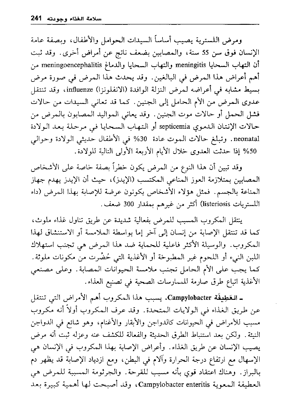 - العطيفة campylobacter: يسبب هذا المكروب أهم الأمراض التي تنتقل عن طريق الغذاء في الولايات المتحدة. وقد عرف المكروب أولا أنه مكروب مسبب للأمراض في الحيوانات كالدواجن والأبقار والأغنام، وهو شائع في الدواجن النيئة ولكن بعد استنباط الطرق الحديثة والفعالة للكشف عنه وعزله ثبت أنه مرض يصيب الإنسان عن طريق الغذاء. وأعراض الإصابة بهذا المكروب في الإنسان هي الإسهال مع ارتفاع درجة الحرارة وآلام في البطن. ومع ازدياد الإصابة قد يظهر دم بالبراز. وهناك اعتقاد قوي بأنه مسبب للقرحة. والجرثومة المسببة للمرض هي العطيفة المعوية Campylobacter وقد أصبحت لها أهمية كبيرة بعد