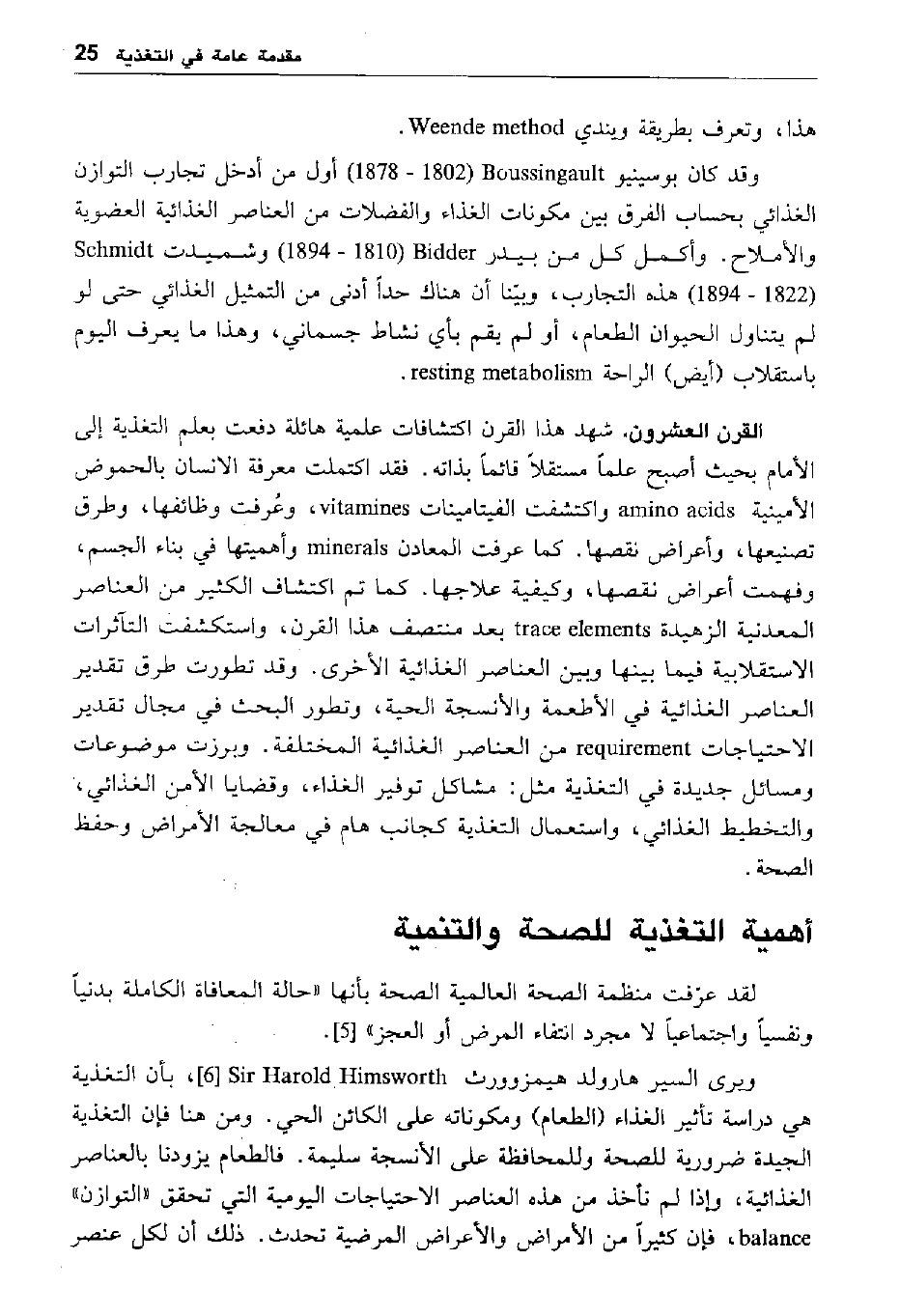 القرن العشرون. شهد هذا القرن اكتشافات علمية هائلة دفعت بعلم التغذية إلى الأمام بحيث أصبح علمًا مستقلا قائمًا بذاته. فقد اكتملت معرفة الإنسان بالحموض الأمينية amino acids واكتشفت الفيتامينات vitamines، وعرفت وظائفها، وطرق تصنيعها، وأعراض نقصها. كما عرفت المعادن minerals وأهميتها في بناء الجسم، وفهمت أعراض نقصها، وكيفية علاجها. كما تم اكتشاف الكثير من العناصر المعدنية الزهيدة trace elements بعد منتصف هذا القرن، واستكشفت التآثرات الاستقلابية فيما بينها وبين العناصر الغذائية الأخرى. وقد تطورت طرق تقدير العناصر الغذائية في الأطعمة والأنسجة الحية، وتطور البحث في مجال تقدير الاحتياجات requirement من العناصر الغذائية المختلفة. وبرزت موضوعات ومسائل جديدة في التغذية مثل: مشاكل توفير الغذاء، وقضايا الأمن الغذائي، والتخطيط الغذائي، واستعمال التغذية كجانب هام في معالجة الأمراض وحفظ الصحة.