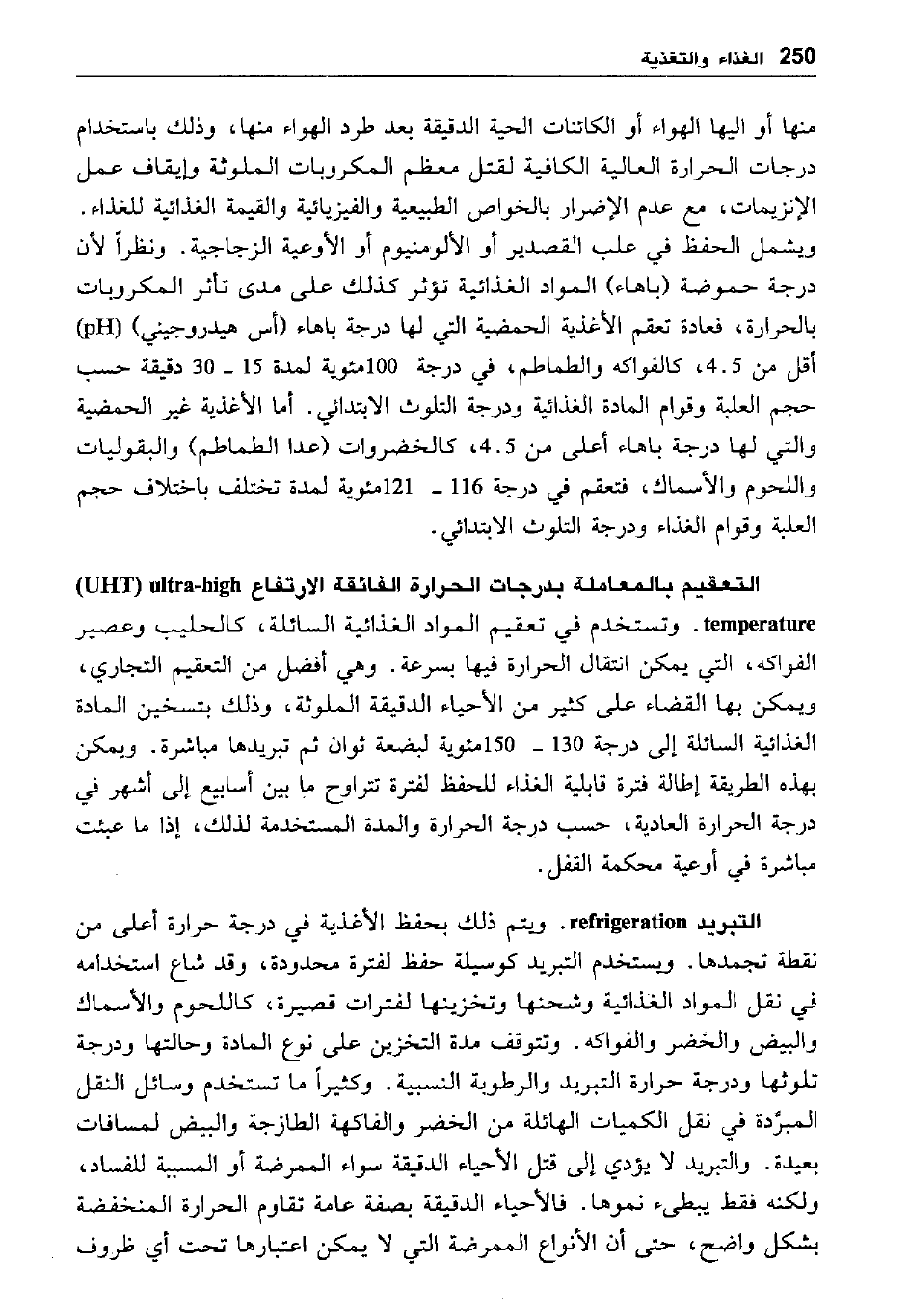 منها أو إليها الهواء أو الكائنات الحية الدقيقة بعد طرد الهواء منها، وذلك باستخدام درجات الحرارة العالية الكافية لقتل معظم المكروبات الملوثة وإيقاف عمل الإنزيمات، مع عدم الإضرار بالخواص الطبيعية والفيزيائية والقيمة الغذائية لغذاء ويشمل الحفظ في علب القصدير أو الألومنيوم أو الأوعية الزجاجية. ونظرا لأن درجة حموضة "باهاء" المواد الغذائية تؤثر كذلك على مدى تأثر المكروبات بالحرارة، فعادة تعقم الأغذية الحمضية التي لها درجة باهاء "أس هيدروجيني" "ph"" أقل من 4.5، كالفواكه والطماطم، في درجة 100 مئوية لمدة 15- 30 دقيقة حسب حجم العلبة وقوام المادة الغذائية ودرجة التلوث الابتدائي. أما الأغذية غير الحمضية والتي لها درجة باهاء أعلى من 4.5، كالخضراوات "عدا الطماطم" والبقوليات واللحوم والأسماك، فتعقم في درجة 116 – 121 مئوية لمدة تختلف باختلاف حجم العلبة وقوام الغذاء ودرجة التلوث الابتدائي.