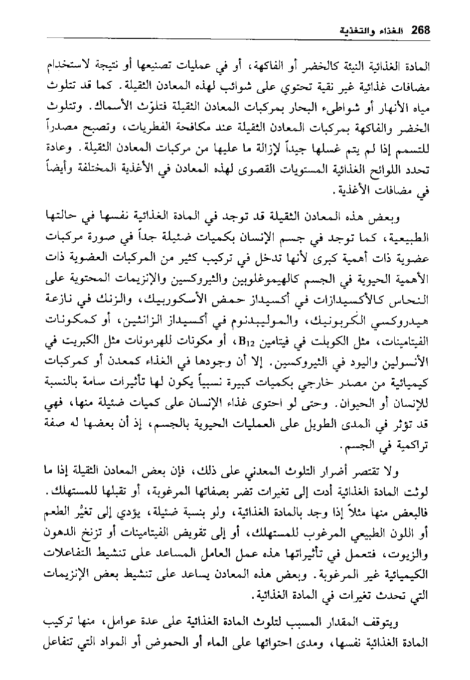 وبعض هذه المعادن الثقيلة قد توجد في المادة الغذائية نفسها في حالتها الطبيعية، كما توجد في جسم الإنسان بكميات ضئيلة جدًّا في صورة مركبات عضويات ذات أهمية كبرى لأنها تدخل في تركيب كثير من المركبات العضوية ذات الأهمية الحيوية في الجسم كالهيموغلوبين والثيروكسين والإنزيمات المحتوية على النحاس كالأكسيدازات في أكسيداز حمض الأسكوربيك، والزنك في نازعة هيدروكسي الكربونيك، والمولبيدنوم في أكسيداز الزانثين، أو كمكونات الفيتامينات، مثل الكوبلت في فيتامين b12، أو مكونات للهرمونات مثل الكبيرت في الأنوسلين واليود في الثيروكسين. إلا أن وجودها في الغذاء كمعدن أو كمركبات كيميائية من مصدر خارجي بكميات كبيرة نسبيا يكون لها تأثيرات سامة بالنسبة للإنسان أو الحيوان. وحتى لو احتوى غذاء الإنسان على كميات ضئيلة منها، فهي قد تؤثر في المدى الطويل على العمليات الحيوية بالجسم، إذ أن بعضها له صفة تراكمية في الجسم.