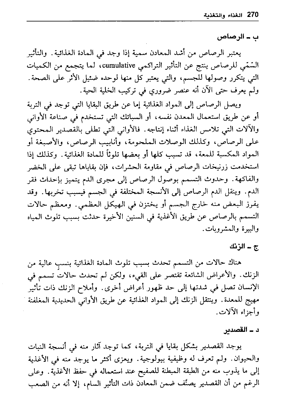 يعتبر الرصاص من أشد المعادن سمية إذا وجد في المادة الغذائية والتأثير السمي للرصاص ينتج عن التأثير التراكمي cumulative، لما يتجمع من الكميات التي يتكرر وصولها للجسم، والتي يعتبر كل منها لوحده ضئيل الأثر على الصحة ولم يعرف حتى الآن أنه عنصر ضروري في تركيب الخلية الحية.