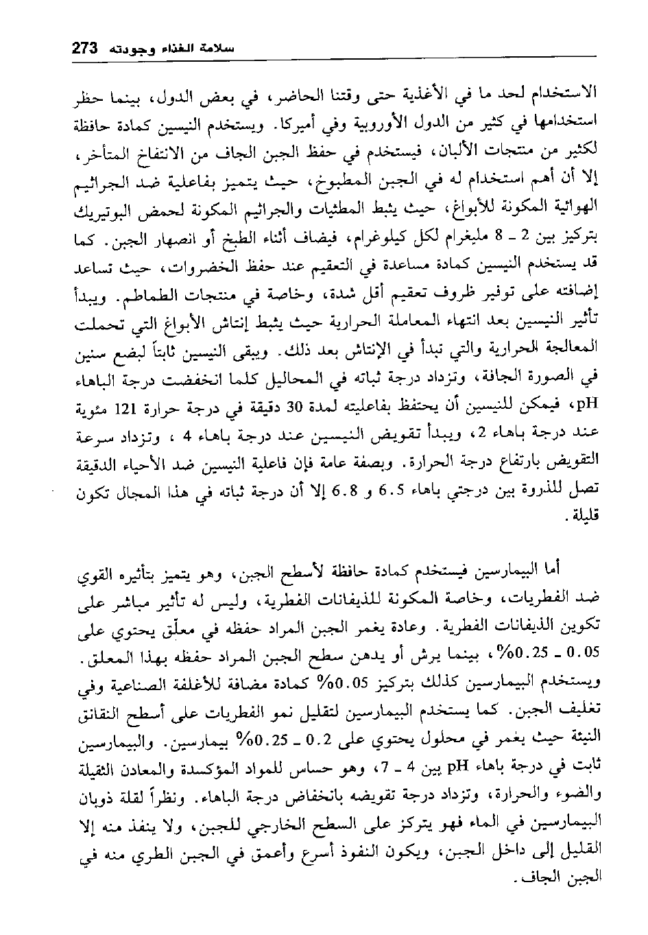 أما البيمارسين فيستخدم كمادة حافظة لأسطح الجبن، وهو يتميز بتأثيره القوي ضد الفطريات، وخاصة المكونة للذيفانات الفطرية، وليس له تأثير مباشر على تكوين الذيفانات الفطرية. وعادة يغمر الجبن المراد حفظه في معلق يحتوي على 0.5 – 0.25 % بينما يرش أو يدهن سطح الجبن المراد حفظه بهذا المعلق ويستخدم البيمارسين كذلك بتركيز 05 0% كمادة مضافة للأغلفة الصناعية وفي تغليف الجبن. كما يستخدم البيمارسين لتقليل نمو الفطريات على أسطح النقانق النيئة حيث يغمر في محلول يحتوي على 0.2 – 25 % بيمارسين والبيمارسين ثابت في درجة باهاء pH بين 4- 7، وهو حساس للمواد المؤكسدة والمعادن الثقيلة والضوء والحرارة، وتزداد درجة تقويضه بانخفاض درجة الباهاء. ونظرا لقلة ذوبان البيمارسين في الماء فهو يتركز على السطح الخارجي للجبن، ولا ينفذ منه إلا القليل إلى داخل الجبن، ويكون النفوذ أسرع وأعمق في الجبن الطري منه في الجبن الجاف.