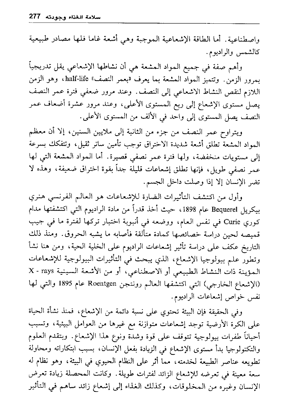 وأهم صفة في جميع المواد المشعة هي أن نشاطها الإشعاعي يقل تدريجيا بمرور الزمن. وتتميز المواد المشعة بما يعرف "بعمر النصف" Half – life، وهو الزمن اللازم لنقص النشاط الإشعاعي إلى النصف. وعند مرور ضعفي فترة عمر النصف يصل مستوى الإشعاع إلى ربع المستوى الأعلى، وعند مرور عشرة أضعاف عمر النصف يصل المستوى إلى واحد في الألف من المستوى الأعلى.