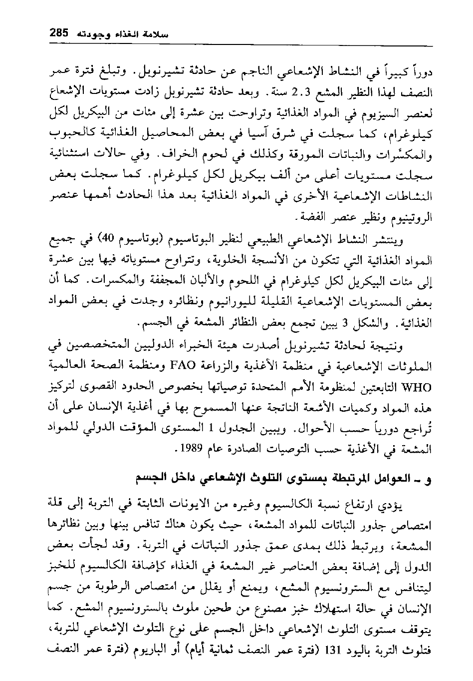 ونتيجة لحادثة تشيرنوبل أصدرت هيئة الخبراء الدوليين المتخصصين في الملوثات الإشعاعية في منظمة الأغذية والزراعة FAO ومنظمة الصحة العالمية WHO التابعتين لمنظومة الأمم المتحدة توصياتها بخصوص الحدود القصوى لتركيز هذه المواد وكميات الأشعة الناتجة عنها المسموح بها في أغذية الإنسان على أن تراجع دوريا حسب الأحوال. ويبين الجدول 1 المستوى المؤقت الدولي للمواد المشعة في الأغذية حسب التوصيات الصادرة عام 1989.