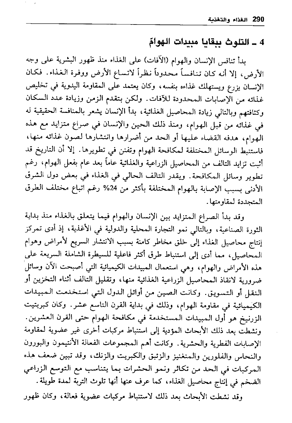 بدأ تنافس الإنسان والهواء "الآفات" على الغذاء منذ ظهور البشرية على وجه الأرض، إلا أنه كان تنافسا محدودا نظرا لاتساع الأرض ووفرة الغذاء. فكان الإنسان يزرع ويستهلك غذاءه بنفسه، وكان يعتمد على المقاومة اليدوية في تخليص غذائه من الإصابات المحدودة للآفات. ولكن بتقدم الزمن وزيادة عدد السكان وكثافتهم وبالتالي زيادة المحاصيل الغذائية، بدأ الإنسان يشعر بالمنافسة الحقيقية له في غذائه من قبل الهوام، ومنذ ذلك الحين والإنسان في صراع متزايد مع هذه الهوام، هدفه القضاء عليها أو الحد من أضرارها وانتشارها لصون غذائه منها، فاستنبط الوسائل المختلفة لمكافحة الهوام وتفنن في تطويرها. إلا أن التاريخ قد أثبت تزايد التالف من المحاصيل الزراعية والغذائية عاما بعد عام بفعل الهوام، رغم تطوير وسائل المكافحة. ويقدر التالف الحالي في الغذاء في بعض دول الشرق الأدنى بسبب الإصابات بالهوام المختلفة بأكثر من 24 % رغم اتباع مختلف الطرق المتجددة لمقاومتها.