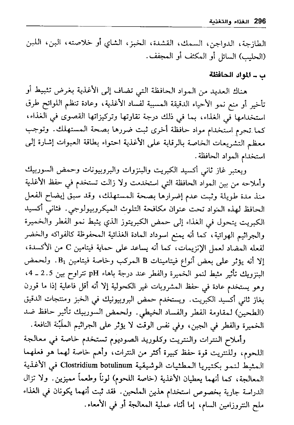 ويعتبر غاز ثاني أكسيد الكبريت والبنزوات والبروبيونات وحمض السوربيك وأملاحه من بين المواد الحافظة التي استخدمت ولا زالت تستخدم في حفظ الأغذية منذ مدة طويلة وثبت عدم إضرارها بصحة المستهلك، وقد سبق إيضاح الفعل الحافظ لهذه المواد تحت عنوان مكافحة التلوث الميكروبيولوجي. فثاني أكسيد الكبريت يتحول في الغذاء إلى حمض الكبريتوز الذي يثبط نمو الفطر والخميرة والجراثيم الهوائية، كما أنه يمنع اسوداد المادة الغذائية المحفوظة كالفواكه والخضر لفعله المضاد لعمل الإنزيمات، كما أنه يساعد على حماية فيتامين C من الأكسدة إلا أنه يؤثر على بعض أنواع فيتامينات B المركب وخاصة فيتامين B1 ولحمض البنزويك تأثير مثبط لنمو الخميرة والفطر عند درجة باهاء PH تتراوح بين 2.5 – 4، وهو يستخدم عادة في حفظ المشروبات غير الكحولية إلا أنه أقل فاعلية إذا ما قورن بغاز ثاني أكسيد الكبريت. ويستخدم حمض البروبيونيك في الخبز ومنتجات الدقيق "الطحين" لمقاومة الفطر والفساد الخيطي. ولحمض السوربيك تأثير حافظ ضد الخميرة والفطر في الجبن، وفي نفس الوقت لا يؤثر على الجراثيم الملبنة النافعة.