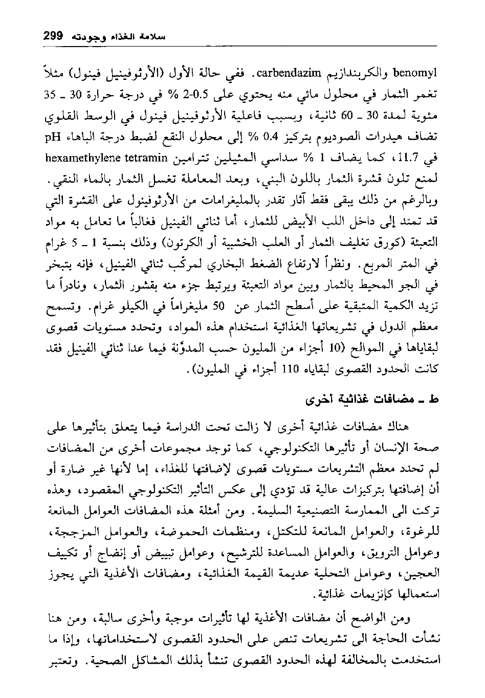 Benomy1 والكربندازيم carbendazim ففي حالة الأول "الأرثوفينيل فينول" مثلا تغمر الثمار في محلول مائي منه يحتوي على 0.5 – 2% في درجة حرارة 30- 35 مئوية لمدة 30 – 60 ثانية، وبسبب فاعلية الأرثوفينيل فينول في الوسط القلوي تضاف هيدرات الصوديوم بتركيز 0.4% إلى محلول النقع لضبط درجة الباهاء ph في 11.7 كما يضاف 1% سداسي المثيلين تترامين hexamethylene tetramin لمنع تلون قشرة الثمار باللون البني، وبعد المعاملة تغسل الثمار بالماء النقي. وبالرغم من ذلك يبقى فقط آثار تقدر بالمليغرامات من الأرثوفينول على القشرة التي قد تمتد على داخل اللب الأبيض للثمار، أما ثنائي الفينيل فغالبا ما تعامل به مواد التعبئة "كورق تغليف الثمار أو العلب الخشبية أو الكرتون" وذلك بنسبة 1- 5 غرام في المتر المربع. ونظرا لارتفاع الضغط البخاري لمركب ثنائي الفينيل، فإنه يتبخر في الجو المحيط بالثمار وبين مواد التعبئة ويرتبط جزء منه بقشور الثمار، ونادرا ما تزيد الكمية المتبقية على أسطح الثمار عن 50 مليغرام في الكيلو غرام. وتسمح معظم الدول في تشريعاتها الغذائية استخدام هذه المواد، وتحدد مستويات قصوى لبقاياها في الموالح "10 أجزاء من المليون حسب المدونة فيما عدا ثنائي الفينيل فقد كانت الحدود القصوى لبقاياه 110 أجزاء في المليون".