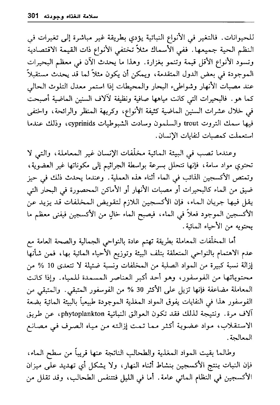 للحيوانات. فالتغير في الأنواع النباتية يؤدي بطريقة غير مباشرة إلى تغيرات في النظم الحية جميعها. ففي الأسماك مثلا تختفي الأنواع ذات القيمة الاقتصادية وتسود الأنواع الأقل قيمة وتنمو بغزارة. وهذا ما يحدث الآن في معظم البحيرات عند مصبات الأنهار وشواطئ البحار والمحيطات إذا استمر معدل التلوث الحالي كما هو. فالبحيرات التي كانت مياهها صافية ونظيفة لآلاف السنين الماضية أصبحت في خلال عشرات السنين الماضية كثيفة الأنواع، وكريهة المنظر والرائحة، واختفى فيها سمك التروت trout والسلمون وسادت الشبوطيات cyprinids وذلك عندما استعملت كمصبات لنفايات الإنسان.