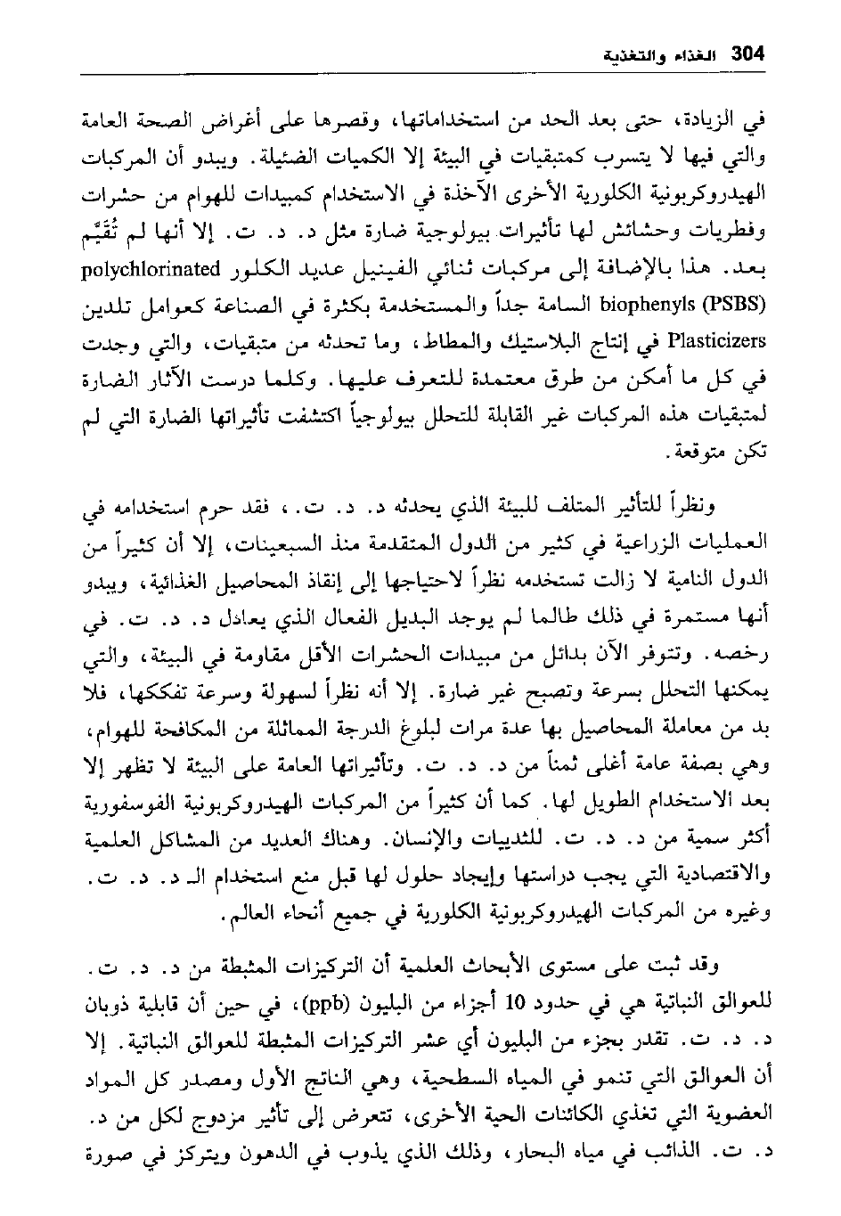 في الزيادة، حتى بعد الحد من استخداماتها، وقصرها على أغراض الصحة العامة والتي فيها لا يتسرب كمتبقيات في البيئة إلا الكميات الضئيلة ويبدو أن المركبات الهيدروكربونية الكلورية الأخرى الآخذة في الاستخدام كمبيدات للهوام من حشرات وفطريات حشائش لها تأثيرات بيولوجية ضارة مثل د. د. ت. إلا أنها لم تقيم بعد. هذا بالإضافة إلى مركبات ثنائي الفينيل عديد الكلو polychlorinated biophenyls "PSBS" السامة جدًّا والمستخدمة بكثرة في الصناعة كعوامل تلدين Plasticizers في إنتاج البلاستيك والمطاط، وما تحدثه من متبقيات، والتي وجدت في كل ما أمكن من طرق معتمدة للتعرف عليها. وكلما درست الآثار الضارة لمتبقيات هذه المركبات غير القابلة للتحلل بيولوجيا اكتشفت تأثيراتها الضارة التي لم تكن متوقعة.