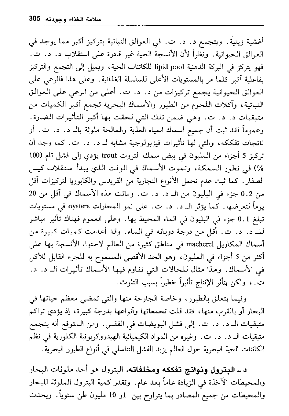 أغشية زيتية. ويتجمع د. د. ت. في العوالق النباتية بتركيز أكبر مما يوجد في العوالق الحيوانية. ونظرا لأن الأنسجة الحية غير قادرة على استقلاب د. د. ت. فهو يتركز في البركة الدهنية lipid pool للكائنات الحية، ويميل إلى التجمع والتركيز العوالق الحيوانية يجمع تركيزات من د. د. ت. أعلى من الرعي على العوالق النباتية، وآكلات اللحوم من الطيور والأسماك البحرية تجمع أكبر الكميات من متبقيات د. د. ت وهي ضمن تلك التي لحقت بها أكبر التأثيرات الضارة. وعموما فقد ثبت أن جميع أسماك المياه الغذبة والمالحة ملوثة بالـ د. د. ت أو ناتجات تفككه، والتي لها تأثيرات فيزيولوجية مشابه لـ د. د. ت. كما وجد أن تركيز 5 أجزاء من المليون في بيض سمك التروت trout يؤدي إلى فشل تام "100%" في تطور السمكة، وتموت الأسماك في الوقت الذي يبدأ استقلاب كيس الصفار. كما ثبت عدم تحمل الأنواع التجارية من القريدس والكابوريا لتركيزات أقل من 0.2 جزء في البليون من الـ د. د. ت. وماتت هذه الأسماك في أقل من 20 يوما لتعرضها. كما يؤثر الـ د. د. ت. وماتت هذه الأسماك في أقل من 20 يوما لتعرضها. كما يؤثر الـ د. د. ت. على نمو المحارات oysters في مستويات تبلغ 0.1 جزء في البليون في الماء المحيط بها. وعلى العموم فهناك تأثير مباشر للـ د. د. ت أقل من درجة ذوبانه في الماء. وقد أعدمت كميات كبيرة من أسماك المكاريل macherel في مناطق كثيرة من العالم لاحتواء الأنسجة بها على أكثر من 5 أجزاء في المليون، وهو الحد الأقصى المسموح به للجزء القابل للأكل في الأسماك. وهذا مثال للحالات التي تقاوم فيها الأسماك تأثيرات الـ د. د. ت.، ولكن يتأثر الإنتاج تأثيرا خطيرا بسبب التلوث.