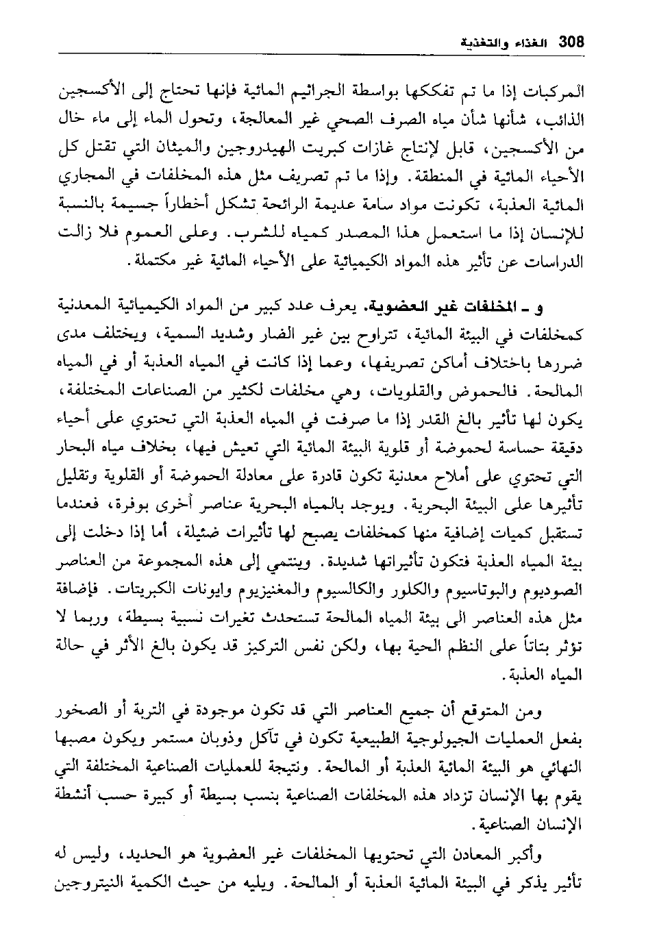 و المخلفات غير العضوية: يعرف عدد كبير من المواد الكيميائية المعدنية كمخلفات في البيئة المائية، تتراوح بين غير الضار وشديد السمية، ويختلف مدى ضررها باختلاف أماكن تصريفها، وعما إذا كانت في المياه العذبة أو في المياه المالحة. فالحموض والقلويات، وهي مخلفات لكثير من الصناعات المختلفة يكون لها تأثير بالغ القدر إذا ما صرفت في المياه العذبة التي تحتوي على أحياء دقيقة حساسة لحموضة أو قلوية البيئة المائية التي تعيش فيها، بخلاف مياه البحار التي تحتوي على أملاح معدنية تكون قادرة على معادلة الحموضة أو القلوية وتقليل تأثيرها على البيئة البحرية. ويوجد بالمياه البحرية عناصر أخرى بوفرة، فعندما تستقبل كميات إضافية منها كمخلفات يصبح لها تأثيرات ضئيلة، أما إذا دخلت إلى بيئة المياه العذبة فتكون تأثيراتها شديدة. وينتمي إلى هذه المجموعة من العناصر الصوديوم والبوتاسيوم والكلور والكالسيوم والمغنيزيوم وايونات الكبريتات. فإضافة مثل هذه العناصر إلى بيئة المياه المالحة تستحدث تغيرات نسبية بسيطة، وربما لا تؤثر بتاتا على النظم الحية بها، ولكن نفس التركيز قد يكون بالغ الأثر في حالة المياه العذبة.