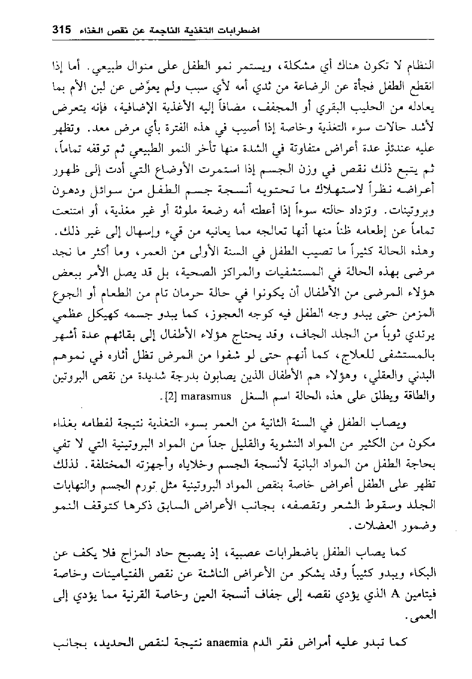 وهذه الحالة كثيرا ما تصيب الطفل في السنة الأولى من العمر. وما أكثر ما نجد مرضى بهذه الحالة في المستشفيات والمراكز الصحية، بل قد يصل الأمر ببعض هؤلاء المرضى من الأطفال أن يكونوا في حالة حرمان تام من الطعام أو الجوع المزمن حتى يبدو وجه الطفل فيه كوجه العجوز، كما يبدو جمسه كهيكل عظمى يرتدي ثوبا من الجلد الجاف، وقد يحتاج هؤلاء الأطفال إلى بقائهم عدة أشهر بالمستشفى للعلاج، كما أنهم حتى لو شفوا من المرض تظل أثاره في نموهم البدني والعقلي، وهؤلاء هم الأطفال الذين يصابون بدرجة شديدة من نقص البروتين والطاقة ويطلق على هذه الحالة اسم السغل [2] marasmus.
