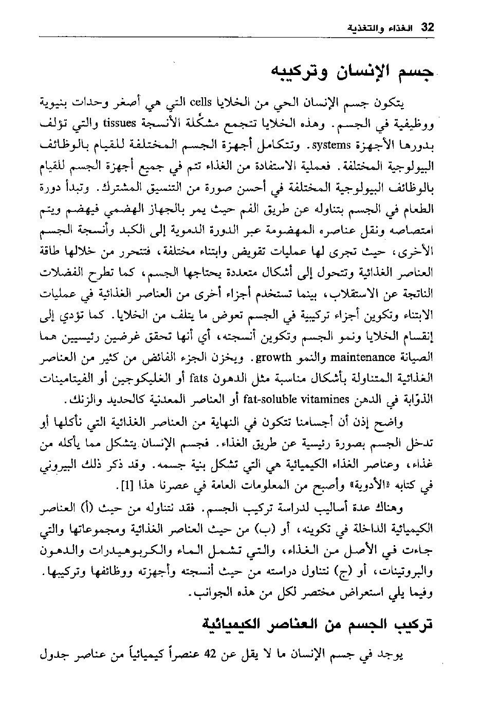 واضح إذن أن أجسامنا تتكون في النهاية من العناصر الغذائية التي نأكلها أو تدخل الجسم بصورة رئيسية عن طريق الغذاء. فجسم الإنسان يتشكل مما يأكله من غذاء، وعناصر الغذاء الكيميائية هي التي تشكل بنية جسمه. وقد ذكر ذلك البيروني في كتابه "الأدوية" وأصبح من المعلومات العامة في عصرنا هذا [1] .