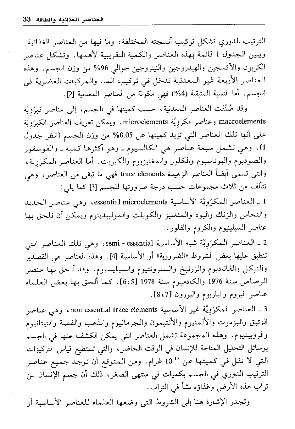 وقد صنفت العناصر المعدنية، حسب كميتها في الجسم، إلى عناصر كبروية macroelements وعناصر مكروية microelements ويمكن تعريف العناصر الكبروية على أنها تلك العناصر التي تزيد كميتها عن 0.05% من وزن الجسم "انظر جدول1"، وهي تشمل سبعة عناصر هي الكالسيوم –وهو أكثرها كمية- والفوسفور والصوديوم والبوتاسيوم والكلور والمغنيزيوم والكبريت أما العناصر المكروية، والتي تسمى أيضا العناصر الزهيدة trace elements فهي ما تبقى من العناصر، وهي تتألف من ثلاث مجموعات حسب درجة ضرورتها للجسم [3] كما يلي: