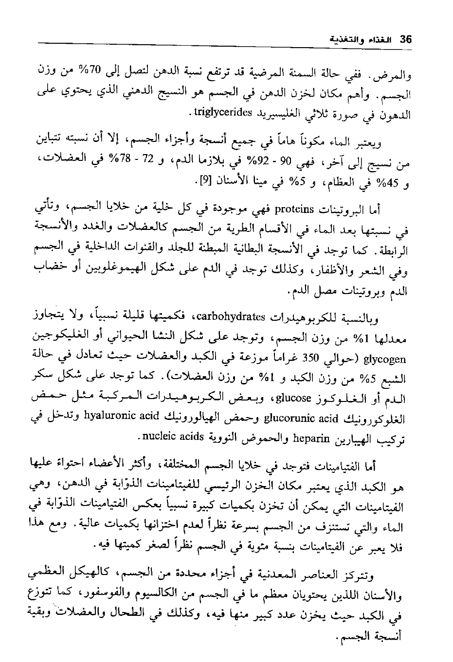 وبالنسبة للكربوهيدرات carbohydrates، فكميتها قليلة نسبيا، ولا يتجاوز معدلها 1 % من وزن الجسم، وتوجد على شكل النشا الحيواني أو الغليكوجين glycogen "حوالي 350 غراما موزعة في الكبد والعضلات حيث تعادل في حالة الشبع 5 % من وزن الكبد و 1 % من وزن العضلات". كما توجد على شكل سكر الدم أو الغلوكوز glucose، وبعض الكربوهيدرات المركبة مثل حمض الغلوكورونيك glucorunic acid وحمض الهيالورونيك hyaluronic acid وتدخل في تركيب الهيبارين heparin والحموض النووية nucleic acids.