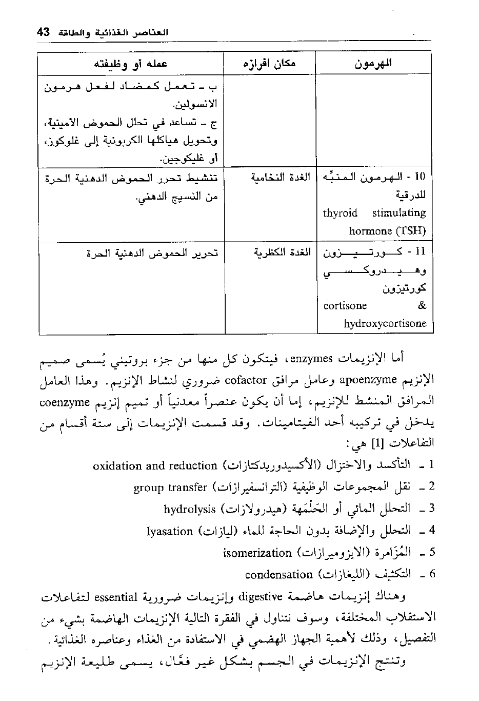 أما الإنزيمات enzymes، فيتكون كل منها من جزء بروتيني يسمى صميم الإنزيم apoenzyme وعامل مرافق cofactor ضروري لنشاط الإنزيم. وهذا العامل المرافق المنشط للإنزيم، إما أن يكون عنصرا معدنيا أو تميم إنزيم coenzyme يدخل في تركيبه أحد الفيتامينات. وقد قسمت الإنزيمات إلى ستة أقسام من التفاعلات [1] هي:
