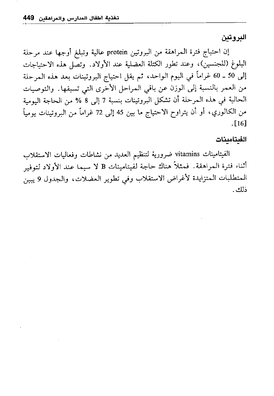إن احتياج فترة المراهقة من البروتين protein. عالية وتبلغ اوجها عند مرحلة اللبلوغ للجنسين، وعند تطور الكتلة العضلية عند الأولال. وتصل هذه الاحتياجات إلى 50- 60 غراما في اليوم الواحد، ثم يقل احتياج البروتينات بعد هذه المرحلة من العمر بالنسبة إلى الوزن عن باقي المراحل الأخرى التي تسبقها. والتوصيات الحالية في هذه المرحلة أن تشكل البروتينات بنسبة 7 إلى 8% من الحاجة اليومية من الكالوري، أو أن يتراوح الاحتياج ما بين 45 إلى 72 غراما من البروتينات يوميا [16] .