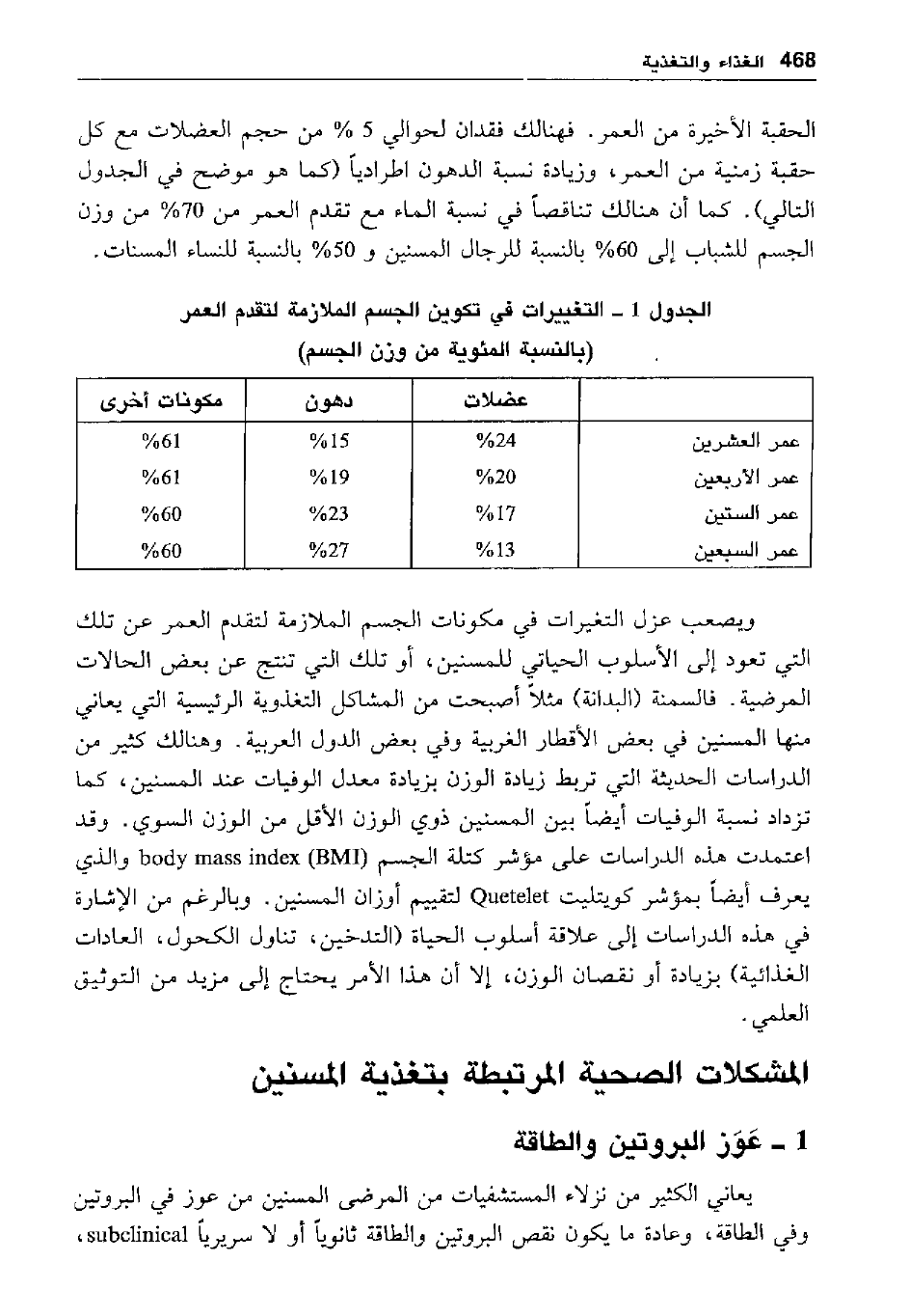 الجدول 1- التغييرات في تكوين الجسم الملازمة لتقدم العمر "بالنسبة المئوية من وزن الجسم"