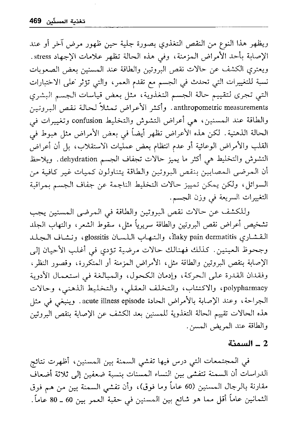 يعاني الكثير من نزلاء المستشفيات من المرضى المسنين من عوز في البروتين وفي الطاقة، وعادة ما يكون نقص البروتين والطاقة ثانويا أو لا سريرياsubclinical، ويظهر هذا النوع من النقص التغذوي بصورة جلية حين ظهور مرض آخر أو عند الإصابة بأحد الأمراض المزمنة، وفي هذه الحالة تظهر علامات الإجهاد stress ويعتري الكشف عن حالات نقص البروتين والطاقة عند المسنين بعض الصعوبات نسبة للتغييرات التي تحدث في الجسم مع تقدم العمر، والتي تؤثر على الاختبارات التي تجري لتقييم حالة الجسم التغذوية، مثل بعض قياسات الجسم البشري anthropometric measurements وأكثر الأعراض تمثلا لحالة نقص البروتين والطاقة عند المسنين، هي أعراض التشوش والتخليط confusion وتغييرات في الحالة الذهنية. لكن هذه الأعراض تظهر أيضا في بعض الأمراض مثل هبوط في القلب والأمراض الوعائية أو عدم انتظام بعض عمليات الاستقلاب، بل أن أعراض التشوش والتخليط هي أكثر ما يميز حالات تجفاف الجسم dehydration ويلاحظ أن المرضى المصابين بنقص البروتين والطاقة يتناولون كميات غير كافية من السوائل، ولكن يمكن تمييز حالات التخليط الناجمة عن جفاف الجسم بمراقبة التغييرات السريعة في وزن الجسم.