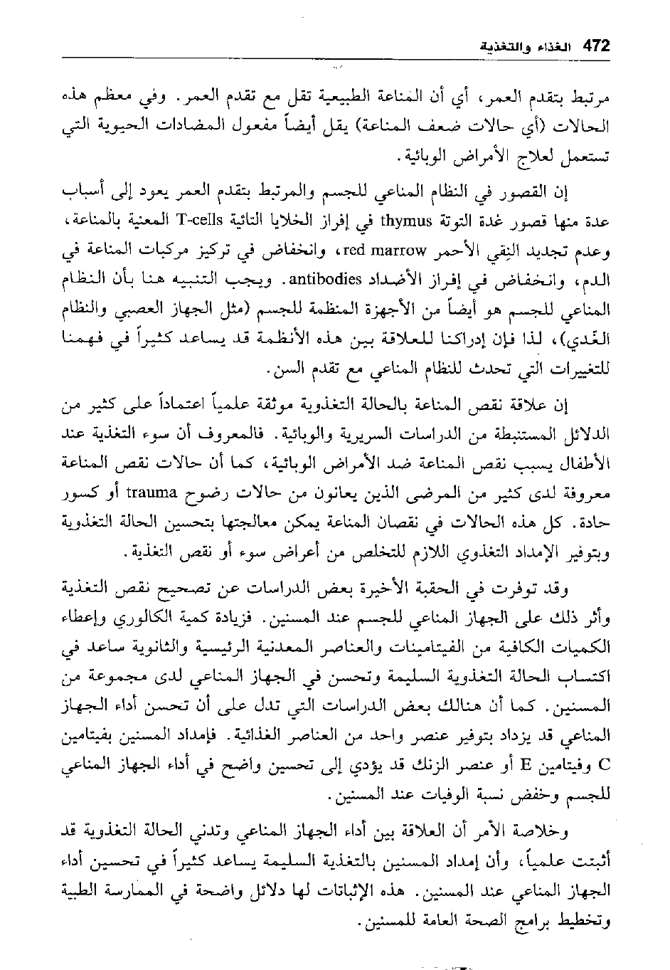 وخلاصة الأمر ان العلاقة بين أداء الجهاز المناعي وتدني الحالة التغذوية قد أثبتت علميا، وأن إمداد المسنين بالتغذية السليمة يساعد كثيرا في تحسين أداء الجهاز المناعي عند المسنين. هذه الإثباتات لها دلائل واضحة في الممارسة الطبية وتخطيط برامج الصحة العامة للمسنين.