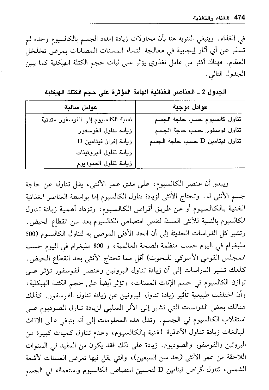 في الغذاء. وينبغي التنويه هنا بأن محاولات زيادة إمداد الجسم بالكالسيوم وحده لم تسفر عن أي آثار إيجابية في معالجة النساء المسنات المصابات بمرض تخلخل العظام. فهناك أكثر من عامل تغذوي يؤثر على ثبات حجم الكتلة الهيكلية كما يبين الجدول التالي.