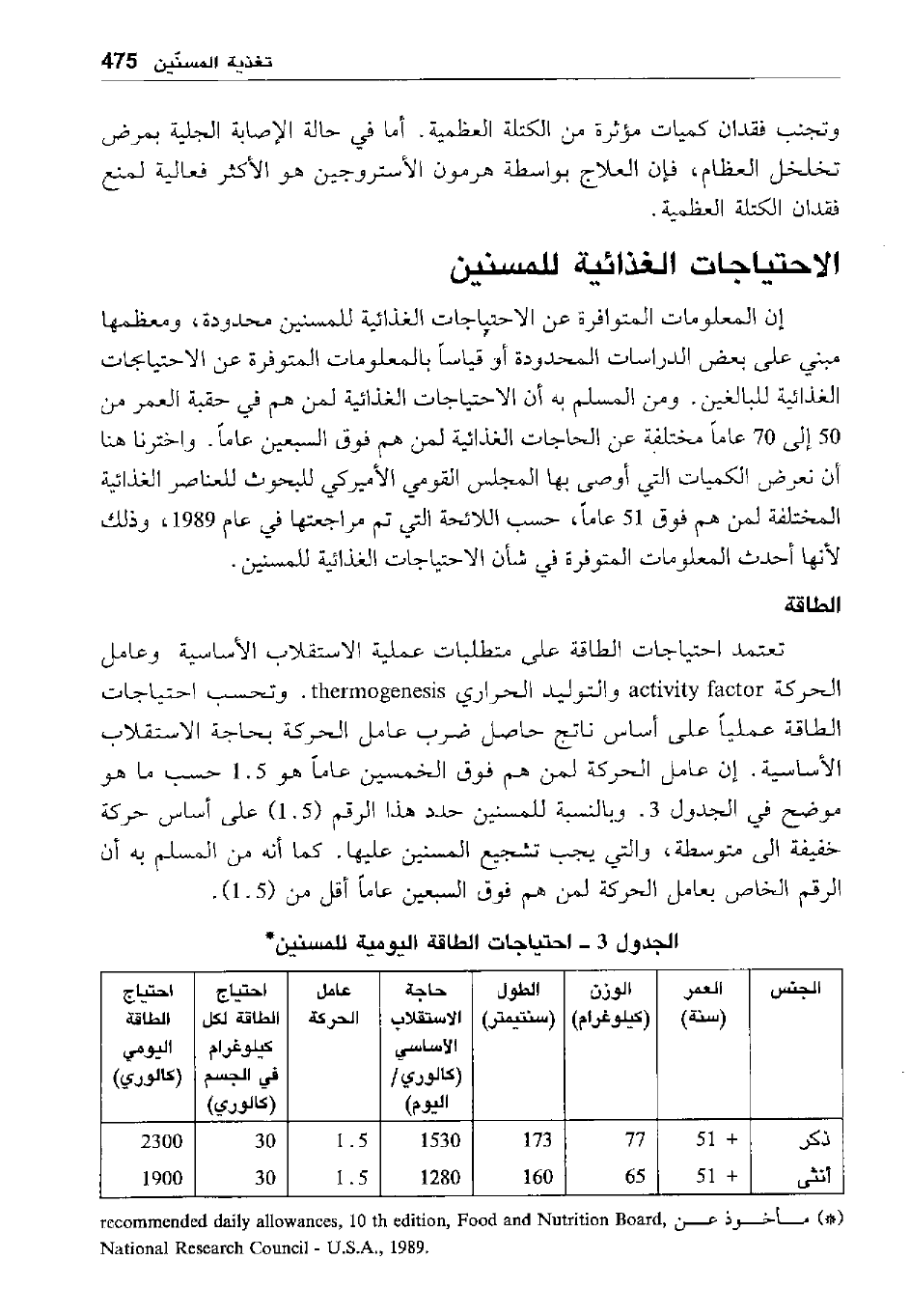 - مأخوذ عن recommended daily allowances 10th edition, Food and Nutrition Board, National Research Council - U.S.A., 1989.